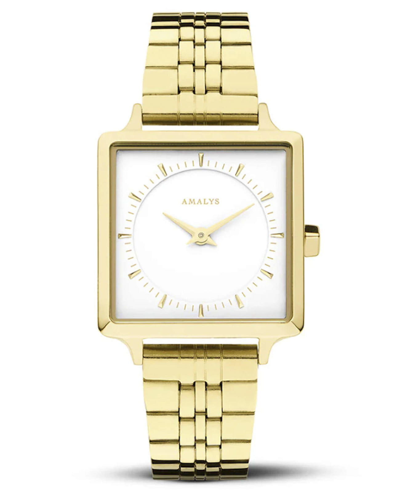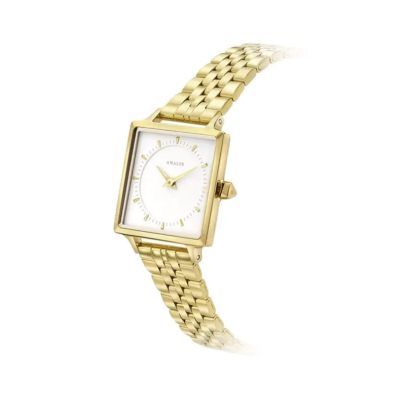 Amalys AMW-137 — женская модель с утончённой минималистичной эстетикой, где квадратный корпус с PVD-покрытиемPVDУльтратонкое покрытие наносится в технике вакуумного напыления, сочетает в себе нитрид титана особой прочности со слоем золота или оксида хрома. Несёт в себе декоративную или защитную функцию. размером 25 мм подчёркивает современный характер и чистоту линий. Механизм — точный кварцевый, обеспечивающий стабильный ход и надёжность в повседневном использовании. Поверхность циферблата оформлена в лаконичном стиле с тонкими метками и стрелками, создающими гармонию и визуальную лёгкость. Защитную функцию выполняет минеральное стеклоМинеральное стеклоМинеральное стекло представляет собой искусственно выращенный минерал кварца. Такое стекло отличается особой устойчивостью к повреждениям и царапинам. Уступает по некоторым качествам сапфировому стеклу., устойчивое к механическим воздействиям и сохраняющее читаемость при ежедневной носке. Браслет с PVD-покрытиемPVDУльтратонкое покрытие наносится в технике вакуумного напыления, сочетает в себе нитрид титана особой прочности со слоем золота или оксида хрома. Несёт в себе декоративную или защитную функцию. оснащён раскладной застёжкойРаскладная застёжкаТакой тип застёжки используется только на браслетах из металла. Она никогда не раскрывается полностью, происходит разделение на 2 и более частей. Раскладывающая застёжка снизит вероятность потери часов к минимуму.. Единство корпуса и браслета создаёт целостный образ, а изысканная простота дизайна делает модель универсальной — она одинаково уместна и в деловой обстановке, и в повседневных сочетаниях.