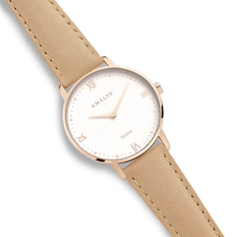 Amalys AMW-186 — женская модель с утончённым классическим дизайном, в которой сочетаются элегантность и практичность. Круглый корпус диаметром 33 мм выполнен из нержавеющей стали с PVD-покрытиемPVDУльтратонкое покрытие наносится в технике вакуумного напыления, сочетает в себе нитрид титана особой прочности со слоем золота или оксида хрома. Несёт в себе декоративную или защитную функцию., гармонирующим с ремешком шириной 16 мм в том же исполнении. Защитную функцию выполняет сапфировое стеклоСапфировое стеклоПрочный и надёжный материал из кристалла сапфира синтетического происхождения, характеризующийся особой твёрдостью и устойчивостью к царапинам и повреждениям., стойкое к царапинам и сохраняющее прозрачность. Механизм — кварцевый, обеспечивающий точность и стабильность хода. Кожаный ремешок на стандартной застежке, который сочетает надёжность фиксации и удобство повседневного использования. Водозащита 3 ATM защищает часы от случайных брызг и дождя. Циферблат с римскими индексами и изящными стрелками подчёркивает классическую эстетику модели, делая её уместной как в повседневных образах, так и в торжественной обстановке.