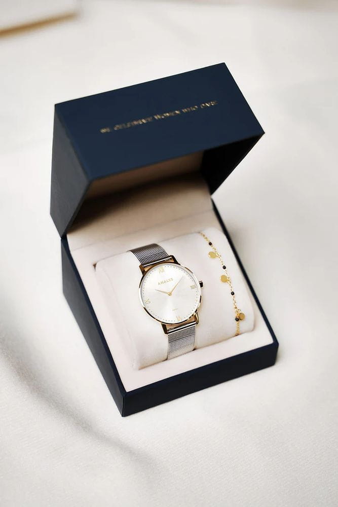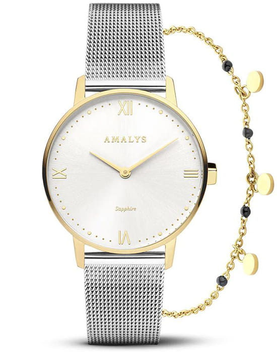 Amalys AMW-195 — женский набор, включающий часы и браслет, выполненный в едином элегантном стиле. Круглый корпус диаметром 33 мм изготовлен из нержавеющей стали с PVDPVDУльтратонкое покрытие наносится в технике вакуумного напыления, сочетает в себе нитрид титана особой прочности со слоем золота или оксида хрома. Несёт в себе декоративную или защитную функцию.-покрытием тёплого золотистого оттенка, что подчёркивает изысканный характер модели. Защитную функцию выполняет сапфировое стеклоСапфировое стеклоПрочный и надёжный материал из кристалла сапфира синтетического происхождения, характеризующийся особой твёрдостью и устойчивостью к царапинам и повреждениям., стойкое к царапинам и сохраняющее прозрачность. Механизм — кварцевый, обеспечивающий точность хода и удобство в использовании. Водозащита 3 ATM защищает от случайных брызг и дождя. Циферблат оформлен в минималистичном стиле с тонкими метками и изящными стрелками, подчёркивающими женственный образ. Стальной браслет миланского плетения с на раскладном замкеРаскладной замокДанный вариант застежки используется только на часах с металлическим браслетом. Отличительная особенность такого крепления в том, что длина браслета становится универсальной и вы можете самостоятельно отрегулировать нужный вам размер – застежка просто двигается по браслету часов. мягко облегает запястье и гармонично сочетается с корпусом. Дополняющий набор браслет усиливает впечатление цельности и придаёт образу завершённость.