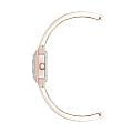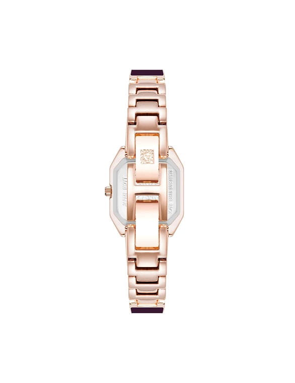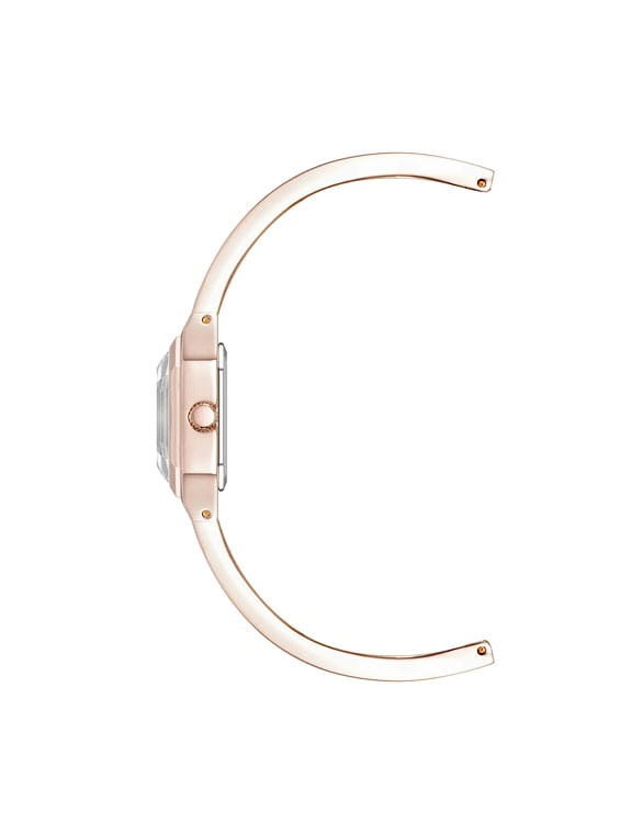 Часы Anne Klein 5158RGBY с корпусом из стали в оттенке розового золота, чьи безелиБезельВнешний ободок, закрепляющий стекло. В спортивных часах так называется поворотное кольцо с делениями на циферблате, выполняет роль таймера – замеряет отрезки времени на шкале. Неподвижный безель – элемент декора. Однонаправленно вращающийся безель на дайверских часах позволяет фиксировать моменты погружения и выныривания на поверхность. украшены сверкающими кристаллами, под которыми скрывается аналоговый фиолетовый циферблат под защитой минеральногоМинеральное стеклоМинеральное стекло представляет собой искусственно выращенный минерал кварца. Такое стекло отличается особой устойчивостью к повреждениям и царапинам. Уступает по некоторым качествам сапфировому стеклу. стекла, а металлический браслет‑бэнгл оснащён удобной ювелирной застёжкой, обеспечивающей надёжную фиксацию и лёгкость снятия, внутри установлен японский кварцевый механизм с батарейным питанием и секундной стрелкой, а конструкция с водозащитой на уровне 3 ATM позволяет выдерживать лёгкие брызги, что делает её эстетически привлекательным и практичным аксессуаром для повседневного и вечернего образа.