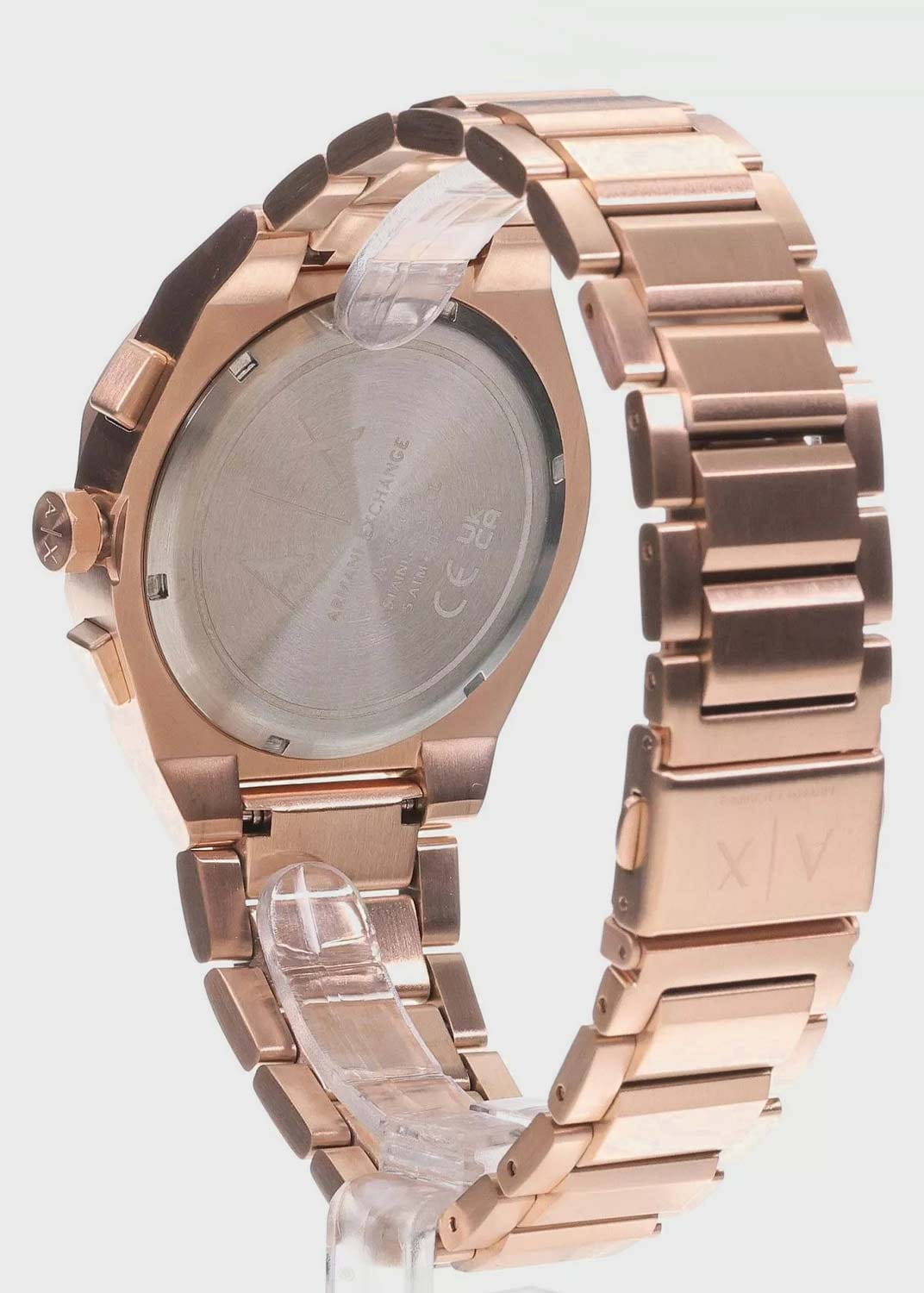 Мужские наручные часы-хронографХронографФункция позволяет измерять отрезки времени с особой точностью: часы, минуты, секунды. Верным признаком хронографа является наличие на циферблате 3 дополнительных окошек-счётчиков. с секундомеромСекундомерСекундоме́р — прибор, способный измерять интервалы времени с точностью до долей секунды. Armani Exchange Rafael AX4188 кварцевый механизм с высокой точностью. Корпус часов изготовлены из нержавеющей стали с IP-покрытиемIP-покрытиеМетод ионного напыления. Демонстрирует повышенную устойчивость к истиранию, окислению и химическим веществам. Под воздействием высокого давления и температуры около 1500°C молекулы металла надёжно соединяются с частицами корпуса часов. цвета розового золота. Минеральное стеклоМинеральное стеклоМинеральное стекло представляет собой искусственно выращенный минерал кварца. Такое стекло отличается особой устойчивостью к повреждениям и царапинам. Уступает по некоторым качествам сапфировому стеклу. защищает их от царапин и повреждений, сохраняя первозданный вид даже при активном использовании. Окошко даты находится в положении между 4 и 5 часов. Стрелки с люминесцентным покрытиемЛюминесцентное покрытиеПозволяет считывать показания времени в темноте. Производители наносят на стрелки, часовые индексы, безель или поверхность циферблата светонакопительный состав, дающий холодное свечение.. 12-ти и 24-х часовой формат времени. Стальной браслет с IP-покрытиемIP-покрытиеМетод ионного напыления. Демонстрирует повышенную устойчивость к истиранию, окислению и химическим веществам. Под воздействием высокого давления и температуры около 1500°C молекулы металла надёжно соединяются с частицами корпуса часов. на раскладной застёжкеРаскладная застёжкаТакой тип застёжки используется только на браслетах из металла. Она никогда не раскрывается полностью, происходит разделение на 2 и более частей. Раскладывающая застёжка снизит вероятность потери часов к минимуму. обеспечивает надежную фиксацию на запястье. Класс водозащиты: 50 метров позволит защитить корпус от случайных брызг или капель дождя. Эта модель – отличный выбор для тех, кто ищет сочетание стиля, качества и функциональности. Часы станут не только полезным аксессуаром, но и выразительным элементом вашего имиджа.