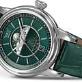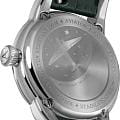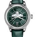 Циферблат в стиле Art Deco украшает усложнение фаз Луны в верхней половине, обрамлённой тонким кольцом облаков. Отмечено окно даты в положении «6 часов». Стрелки и накладные метки обработаны люминесцентным покрытиемЛюминесцентное покрытиеПозволяет считывать показания времени в темноте. Производители наносят на стрелки, часовые индексы, безель или поверхность циферблата светонакопительный состав, дающий холодное свечение. Superluminova — для уверенного считывания в темноте. Поверхность защищена сапфировым стекломСапфировое стеклоПрочный и надёжный материал из кристалла сапфира синтетического происхождения, характеризующийся особой твёрдостью и устойчивостью к царапинам и повреждениям. с антибликовым покрытием.