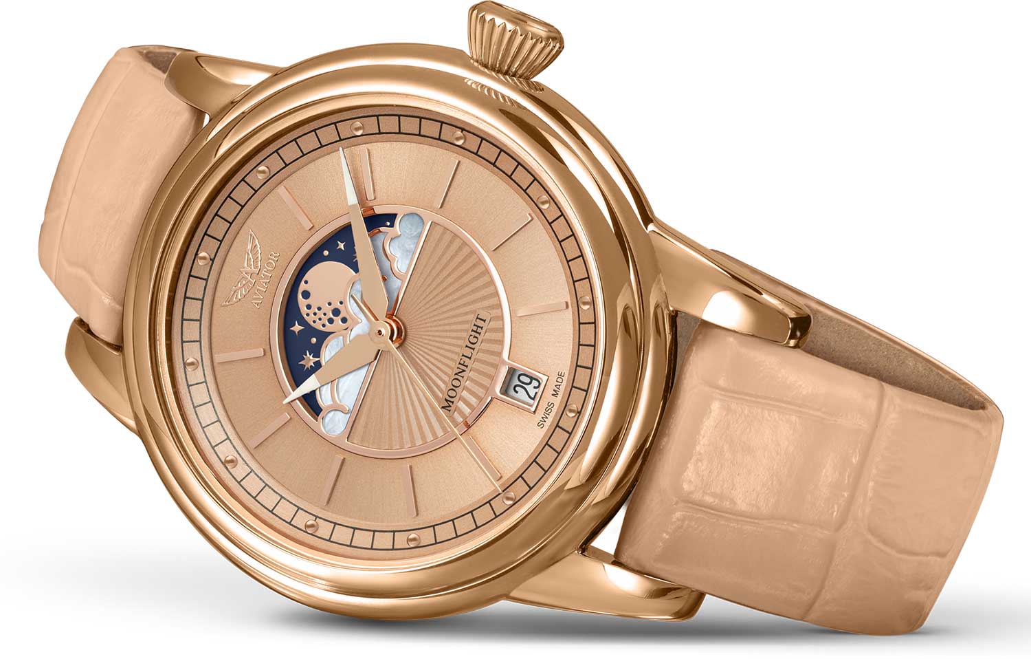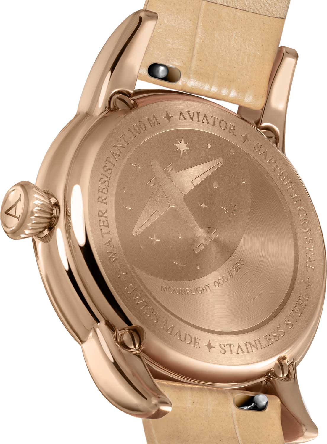 Aviator Douglas MoonFlight V.1.33.2.260.4 — элегантные дамские швейцарские часы с утончённой авиационной эстетикой. Корпус 36 мм из нержавеющей стали 316L с PVD-покрытиемPVDУльтратонкое покрытие наносится в технике вакуумного напыления, сочетает в себе нитрид титана особой прочности со слоем золота или оксида хрома. Несёт в себе декоративную или защитную функцию. обладает компактными пропорциями и удобным профилем. Циферблат в стиле Art Deco украшает усложнение фаз Луны в верхней половине, обрамлённой тонким кольцом облаков. Отмечено окно даты в положении «6 часов». Стрелки обработаны люминесцентным покрытиемЛюминесцентное покрытиеПозволяет считывать показания времени в темноте. Производители наносят на стрелки, часовые индексы, безель или поверхность циферблата светонакопительный состав, дающий холодное свечение. Superluminova — для уверенного считывания в темноте. Поверхность защищена сапфировым стекломСапфировое стеклоПрочный и надёжный материал из кристалла сапфира синтетического происхождения, характеризующийся особой твёрдостью и устойчивостью к царапинам и повреждениям. с антибликовым покрытиемАнтибликовое покрытиеСлой оксида металла в 0,13-0,3 микрон, благодаря которому стекло часов не бликует и не отражает свет. Антибликовое покрытие уменьшает отражение света в 10 раз, обеспечивая отличную читаемость показателей циферблата.. Сердце модели — швейцарский кварцевый механизм Ronda 708 с функцией отображения лунных фаз, 13 рубинами и возможностью работать до 54 месяцев без замены батареи. Завинчивающаяся задняя крышка с гравировкой Douglas DC-3 и водозащита до 100 метров создают надёжную основу для эксплуатации.Кожаный ремень со стандартной застежкой сочетает в себе комфорт, элегантность и практичность. Лимитированная серия - 950 экземпляров. Aviator Douglas MoonFlight — это гармоничное сочетание авиационного наследия, женской элегантности и технической изысканности, воплощённое в элегантном и функциональном аксессуаре.