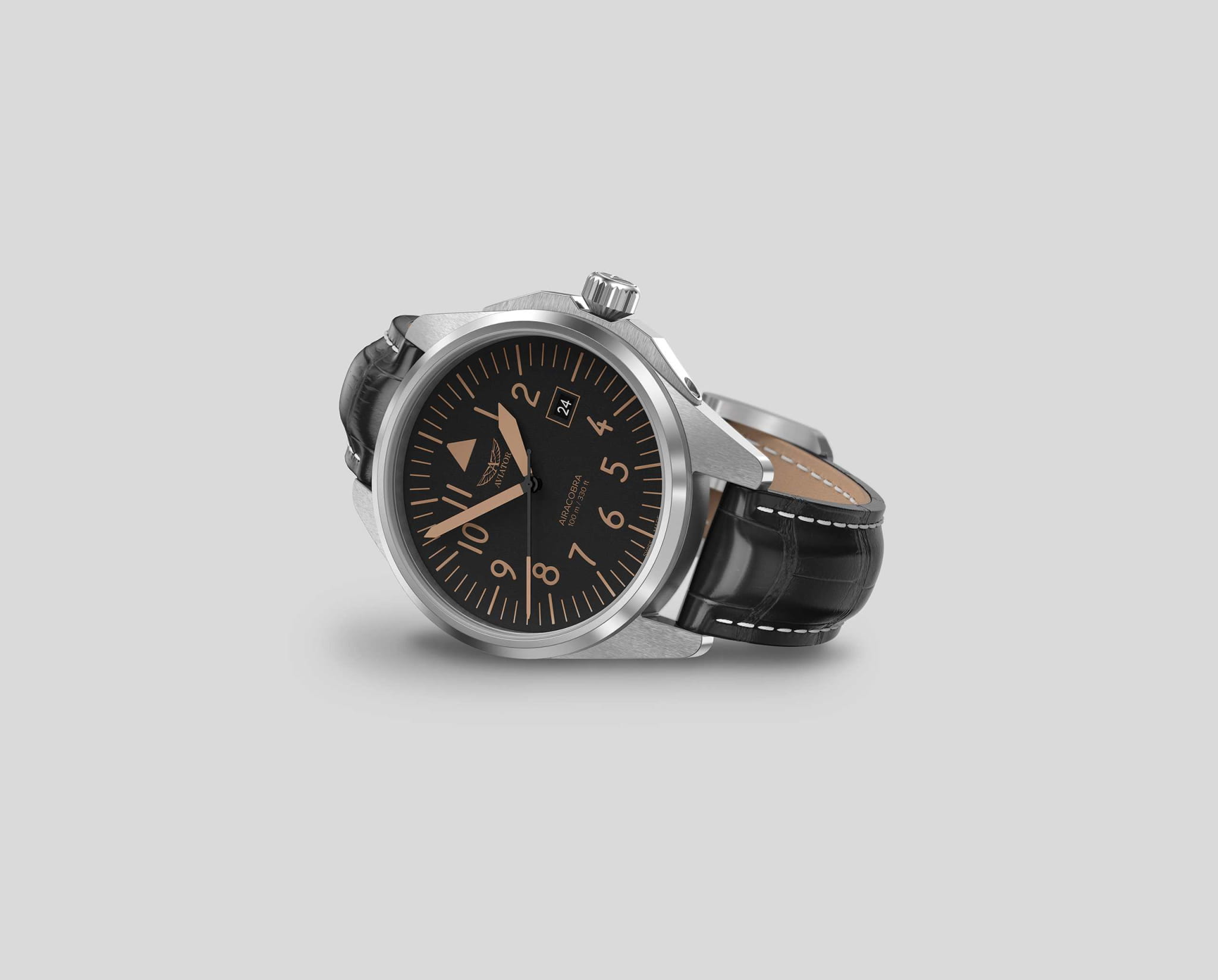 Aviator V.1.38.0.316.4 “Airacobra 43 Type A” — надёжные швейцарские пилотские часы с насыщенным функционалом и строгим авиационным дизайном. Корпус диаметром 42,8 мм выполнен из нержавеющей стали.