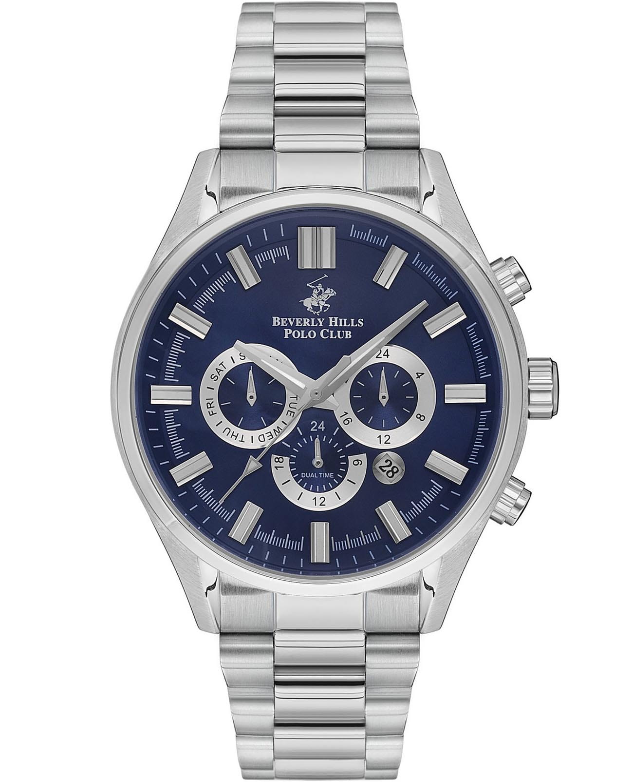 Американские мужские часы Beverly Hills Polo Club BP3395X.390 c хронографомХронографФункция позволяет измерять отрезки времени с особой точностью: часы, минуты, секунды. Верным признаком хронографа является наличие на циферблате 3 дополнительных окошек-счётчиков.. Минеральное стеклоМинеральное стеклоМинеральное стекло представляет собой искусственно выращенный минерал кварца. Такое стекло отличается особой устойчивостью к повреждениям и царапинам. Уступает по некоторым качествам сапфировому стеклу. устойчивое к появлению царапин, обладающее высокой прозрачностью. Класс водозащиты: 50 метров, позволит защитить корпус от случайных брызг или капель дождя. Корпус часов изготовлен из стали. Стальной браслет на раскладной застёжкеРаскладная застёжкаТакой тип застёжки используется только на браслетах из металла. Она никогда не раскрывается полностью, происходит разделение на 2 и более частей. Раскладывающая застёжка снизит вероятность потери часов к минимуму.. Стрелки и метки с люминесцентным покрытиемЛюминесцентное покрытиеПозволяет считывать показания времени в темноте. Производители наносят на стрелки, часовые индексы, безель или поверхность циферблата светонакопительный состав, дающий холодное свечение.. Окошко даты находится в положении между 4 и 5 часов.