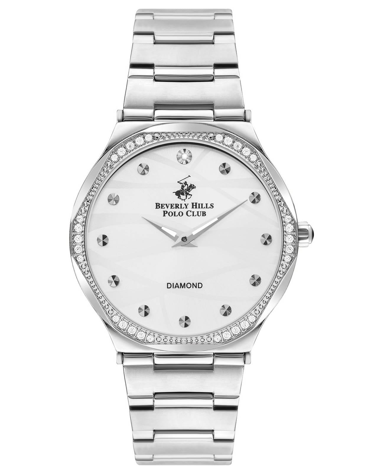 Американские женские часы с минеральным стекломМинеральное стеклоМинеральное стекло представляет собой искусственно выращенный минерал кварца. Такое стекло отличается особой устойчивостью к повреждениям и царапинам. Уступает по некоторым качествам сапфировому стеклу. Beverly Hills Polo Club BP3399C.330, кварцевый механизм с высокой точностью. Корпус и браслет часов изготовлены из нержавеющей стали. БезельБезельВнешний ободок, закрепляющий стекло. В спортивных часах так называется поворотное кольцо с делениями на циферблате, выполняет роль таймера – замеряет отрезки времени на шкале. Неподвижный безель – элемент декора. Однонаправленно вращающийся безель на дайверских часах позволяет фиксировать моменты погружения и выныривания на поверхность. и циферблат украшены синтетическими бриллиантами. Стрелки с люминесцентным покрытиемЛюминесцентное покрытиеПозволяет считывать показания времени в темноте. Производители наносят на стрелки, часовые индексы, безель или поверхность циферблата светонакопительный состав, дающий холодное свечение.. Класс водозащиты: 50 метров, позволит защитить корпус от случайных брызг или капель дождя. Стальной браслет на раскладной застёжкеРаскладная застёжкаТакой тип застёжки используется только на браслетах из металла. Она никогда не раскрывается полностью, происходит разделение на 2 и более частей. Раскладывающая застёжка снизит вероятность потери часов к минимуму..