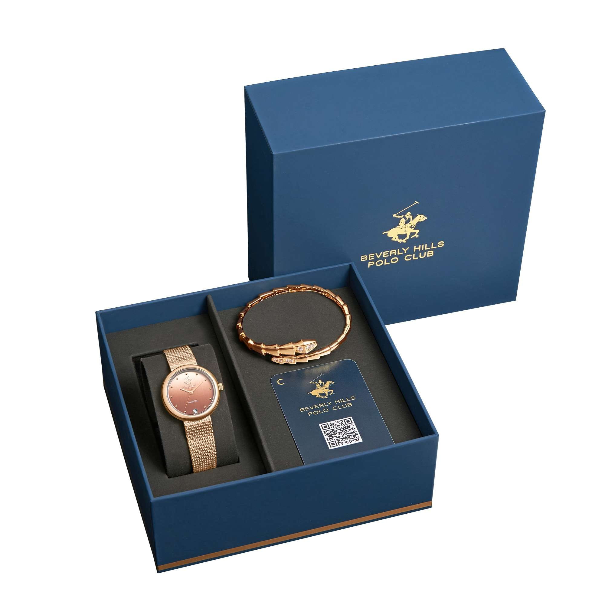 Beverly Hills Polo Club BP3760X.440 — женские часы, сочетающие изящество и функциональность в компактном формате. Корпус из стали диаметром 30 мм и браслет украшены IP‑покрытиемIP-покрытиеМетод ионного напыления. Демонстрирует повышенную устойчивость к истиранию, окислению и химическим веществам. Под воздействием высокого давления и температуры около 1500°C молекулы металла надёжно соединяются с частицами корпуса часов. золотого оттенка, создавая благородный дизайн. Стрелки и метки выполнены в золоте, подчёркивая элегантность и визуальную лёгкость. Механизм — точный кварцевый, надёжный и неприхотливый, требующий только замены батареи раз в 1–2 года . Циферблат покрыт прочным минеральным стекломМинеральное стеклоМинеральное стекло представляет собой искусственно выращенный минерал кварца. Такое стекло отличается особой устойчивостью к повреждениям и царапинам. Уступает по некоторым качествам сапфировому стеклу., устойчивым к царапинам и сохраняющим безупречный внешний вид . Браслет миланского плетения на раскладном замкеРаскладной замокДанный вариант застежки используется только на часах с металлическим браслетом. Отличительная особенность такого крепления в том, что длина браслета становится универсальной и вы можете самостоятельно отрегулировать нужный вам размер – застежка просто двигается по браслету часов., обеспечивая плавное и надёжное прилегание. Водозащита на уровне 3 ATM (≈30 м) защищает от брызг и случайных осадков . Beverly Hills Polo Club — утончённый аксессуар для женщин, ценящих стиль, надёжность и изысканные детали, где каждая функция подчёркнута строгой, но изящной эстетикой. Элегантный браслет в комплекте выполнен из стали с золотым покрытием и гармонично сочетается с дизайном часов. Универсальная форма и качественная застёжка обеспечивают комфорт при ношении, а лаконичный стиль делает его идеальным дополнением к образу — как для повседневной носки, так и для особых случаев.