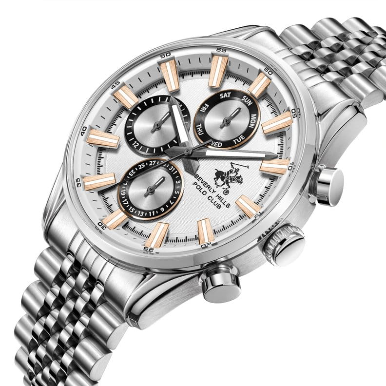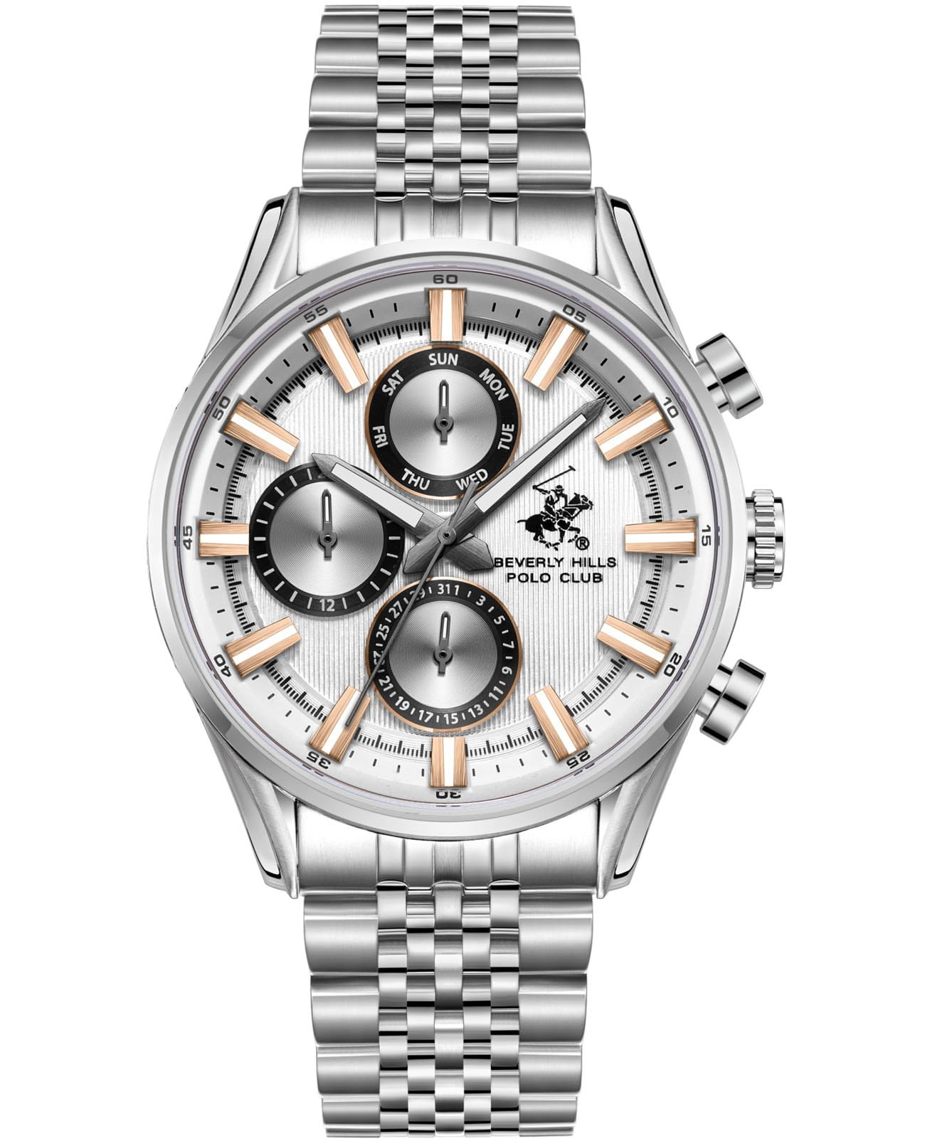 BEVERLY HILLS POLO CLUB BP3823X.330 — стильные мужские часы, сочетающие спортивную динамику и функциональность. Крупный корпус выполнен из нержавеющей стали серебристого цвета, диаметром 42,5 мм, гармонично дополнен стальным браслетом на раскладной застёжкеРаскладная застёжкаТакой тип застёжки используется только на браслетах из металла. Она никогда не раскрывается полностью, происходит разделение на 2 и более частей. Раскладывающая застёжка снизит вероятность потери часов к минимуму., что обеспечивает комфортное ношение. Минеральное стеклоМинеральное стеклоМинеральное стекло представляет собой искусственно выращенный минерал кварца. Такое стекло отличается особой устойчивостью к повреждениям и царапинам. Уступает по некоторым качествам сапфировому стеклу. с сапфировым покрытием защищает циферблат от царапин, а кварцевый механизм обеспечивает высокую точность. Благодаря своей универсальной эстетике эти часы уместны и в деловой среде, и в повседневном образе. Стрелки и метки с люминесцентным покрытиемЛюминесцентное покрытиеПозволяет считывать показания времени в темноте. Производители наносят на стрелки, часовые индексы, безель или поверхность циферблата светонакопительный состав, дающий холодное свечение., обеспечивающим хорошую читаемость в темноте. Указатель дня недели вынесен на отдельный циферблат, также присутствует индикация 24-часового формата времени. Идеальный выбор для тех, кто ценит элегантный дизайн и качество. Водозащита до 50 метров позволит защитить корпус от случайных брызг или капель дождя.