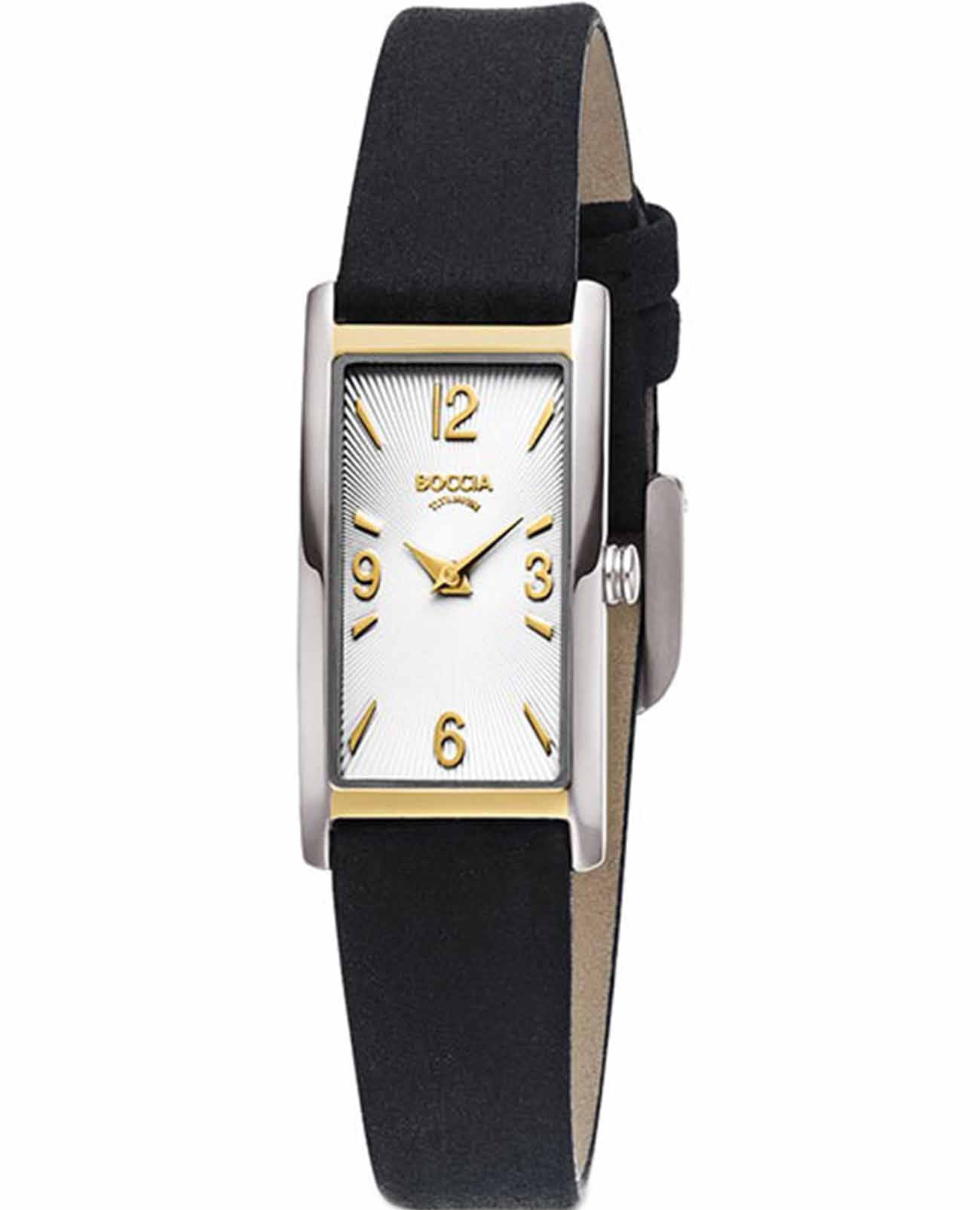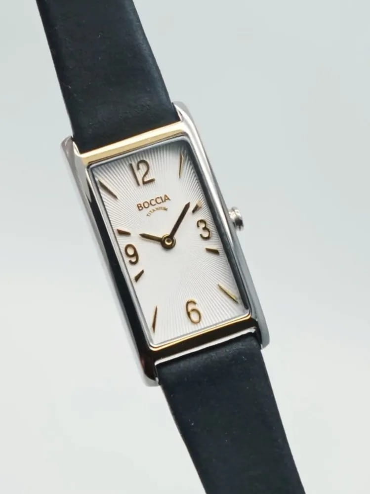 Женские часы Boccia 3366-02, которые станут стильным и функциональным аксессуаром для современной женщины. Эти часы оснащены кварцевым механизмом Miyota 5Y20, обеспечивающим точное и надежное отсчитывание времени. Центральные часовая и минутная стрелки выделяются на элегантном серебристом циферблате, создавая контрастный и выразительный образ. Прямоугольный корпус часов выполнен из суперлегкого титана с частичным PVDPVDУльтратонкое покрытие наносится в технике вакуумного напыления, сочетает в себе нитрид титана особой прочности со слоем золота или оксида хрома. Несёт в себе декоративную или защитную функцию.-покрытием цвета желтого золота, что делает их невероятно комфортными для ежедневного ношения. Размер корпуса 35х18 мм добавляет изысканности и утонченности внешнему виду. Особое внимание привлекает черный кожаный ремешок, который придаёт часам современный и элегантный вид. А Классическая застежка обеспечивает удобство и надежность фиксации. Прочное выпуклое минеральное стеклоМинеральное стеклоМинеральное стекло представляет собой искусственно выращенный минерал кварца. Такое стекло отличается особой устойчивостью к повреждениям и царапинам. Уступает по некоторым качествам сапфировому стеклу. защищает циферблат от мелких механических повреждений, гарантируя долговечность и сохранение первоначального внешнего вида. Водостойкость уровня WR 30 обеспечивает защиту от брызг, делая их подходящими для повседневного использования.