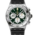 Мужские швейцарские часы-хронограф с секундомером Breitling B01 42 NFL Green Bay Packers Edition AB01342B1L1S1, механический механизм (автоматический калибр) с высокой точностью. Сапфировое стеклоСапфировое стеклоПрочный и надёжный материал из кристалла сапфира синтетического происхождения, характеризующийся особой твёрдостью и устойчивостью к царапинам и повреждениям. устойчивое к появлению царапин, обладающее высокой прозрачностью. Класс водозащиты: 200 метров, позволит плавать, нырять и заниматься другими водными видами спорта. Корпус часов изготовлен из нержавеющей стали. Браслет из каучука на раскладной застёжкеРаскладная застёжкаТакой тип застёжки используется только на браслетах из металла. Она никогда не раскрывается полностью, происходит разделение на 2 и более частей. Раскладывающая застёжка снизит вероятность потери часов к минимуму.. Стрелки и метки с люминесцентным покрытиемЛюминесцентное покрытиеПозволяет считывать показания времени в темноте. Производители наносят на стрелки, часовые индексы, безель или поверхность циферблата светонакопительный состав, дающий холодное свечение.. Шкала тахиметра на циферблате. Окошко даты находится в положении 6 часов.