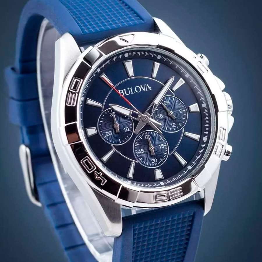 Мужские кварцевые часы-хронографХронографФункция позволяет измерять отрезки времени с особой точностью: часы, минуты, секунды. Верным признаком хронографа является наличие на циферблате 3 дополнительных окошек-счётчиков. Bulova Classic 96K103 – отражающий идеальное сочетание современного дизайна, надёжности и функциональности. Элегантный облик станет превосходным завершением образа, наделив его индивидуальным характером. Корпус из нержавеющей стали диаметром 42 мм идеально сбалансирован и элегантен. Минеральное стеклоМинеральное стеклоМинеральное стекло представляет собой искусственно выращенный минерал кварца. Такое стекло отличается особой устойчивостью к повреждениям и царапинам. Уступает по некоторым качествам сапфировому стеклу. защищает циферблат от царапин и устойчивое к мелким механическим повреждениям.Силиконовый ремешок синего цвета на стандартной застежке обеспечивает комфортное ношение. Стрелки и метки с люминесцентным покрытиемЛюминесцентное покрытиеПозволяет считывать показания времени в темноте. Производители наносят на стрелки, часовые индексы, безель или поверхность циферблата светонакопительный состав, дающий холодное свечение. позволяющие легко определять время даже в темноте. Водозащита 100 метров, позволит плавать, нырять и заниматься другими водными видами спорта. Эта модель – отличный выбор для тех, кто ищет сочетание стиля, качества и функциональности. Часы станут не только полезным аксессуаром, но и выразительным элементом вашего имиджа.