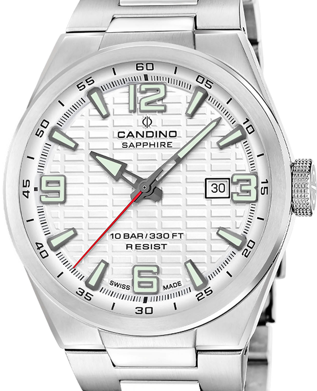 Мужские кварцевые часы Candino из коллекции Series 1947 — это сочетание классического дизайна, надёжности и швейцарского качества. Корпус диаметром 43 мм выполнен из нержавеющей стали. Циферблат белого цвета оформлен индексами и стрелками с люминесцентным покрытиемЛюминесцентное покрытиеПозволяет считывать показания времени в темноте. Производители наносят на стрелки, часовые индексы, безель или поверхность циферблата светонакопительный состав, дающий холодное свечение.. Окошко даты расположено в положении 3 часов. Циферблат защищён сапфировым стекломСапфировое стеклоПрочный и надёжный материал из кристалла сапфира синтетического происхождения, характеризующийся особой твёрдостью и устойчивостью к царапинам и повреждениям., устойчивым к царапинам. Механизм — кварцевый, обеспечивает высокую точность хода. Часы оснащены стальным браслетом с раскладной застёжкойРаскладная застёжкаТакой тип застёжки используется только на браслетах из металла. Она никогда не раскрывается полностью, происходит разделение на 2 и более частей. Раскладывающая застёжка снизит вероятность потери часов к минимуму.. Водонепроницаемость 100 м позволяет использовать часы для плавания и повседневного ношения. Гарантия — 2 года. Идеальный выбор для тех, кто ценит стиль, точность и надёжность.