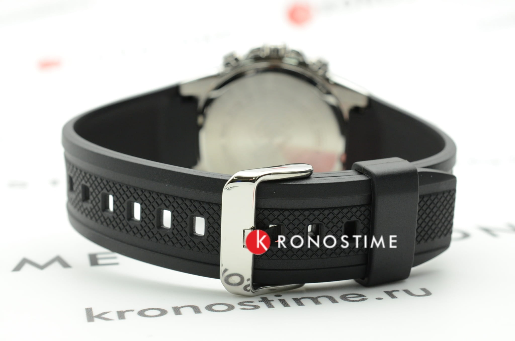 Аксессуар подарит вам истинное удовольствие не только при использовании, но и порадует оригинальным оформлением. Привлекательный узор, необычное расположение миниатюрных окошек-счётчиков, броские элементы - всё это являет тщательно проработанный дизайн. Чёрный безельБезельВнешний ободок, закрепляющий стекло. В спортивных часах так называется поворотное кольцо с делениями на циферблате, выполняет роль таймера – замеряет отрезки времени на шкале. Неподвижный безель – элемент декора. Однонаправленно вращающийся безель на дайверских часах позволяет фиксировать моменты погружения и выныривания на поверхность. имеет износоустойчивое PVD-покрытиеPVDУльтратонкое покрытие наносится в технике вакуумного напыления, сочетает в себе нитрид титана особой прочности со слоем золота или оксида хрома. Несёт в себе декоративную или защитную функцию.. Завинчивающаяся задняя крышка. Люминесцентное светонакопительное покрытиеЛюминесцентное покрытиеПозволяет считывать показания времени в темноте. Производители наносят на стрелки, часовые индексы, безель или поверхность циферблата светонакопительный состав, дающий холодное свечение. стрелок и меток. Минеральное стекло. Каучуковый гибкий ремешок. ХронографХронографФункция позволяет измерять отрезки времени с особой точностью: часы, минуты, секунды. Верным признаком хронографа является наличие на циферблате 3 дополнительных окошек-счётчиков., секундомер, отображение текущего числа. Габариты: 43,8 x 49,1 x 10,8 мм.