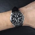 Японские мужские часы из коллекции Edifice являются стильным аксессуаром на каждый день, подходят для дополнения спортивного или повседневного стиля в одежде. Модель отличается лаконичностью благодаря использованию сдержанной цветовой гаммой, красиво сочетается чёрный циферблат с счётчиками хронографаХронографФункция позволяет измерять отрезки времени с особой точностью: часы, минуты, секунды. Верным признаком хронографа является наличие на циферблате 3 дополнительных окошек-счётчиков. и чёрный ремешок из натуральной кожи, поверхность которого сделана под кожу крокодила. Ударопрочный корпусУдаропрочный корпусМеханизм заключён в корпус, выполненный из современных материалов, устойчивых к ударам, механическим повреждениям и падению с высоты: инновационный пластик, карбон, нержавеющая сталь, титан. из нержавеющей стали 316L защищает кварцевый механизм с высокой точностью хода. Люминесцентная подсветкаЛюминесцентное покрытиеПозволяет считывать показания времени в темноте. Производители наносят на стрелки, часовые индексы, безель или поверхность циферблата светонакопительный состав, дающий холодное свечение.. Закалённое минеральное стекло. Водонепроницаемость до 10 бар. Секундомер, окошко даты. Габариты: 43,8 x 48,5 x 11,6 мм.