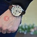 Кварцевый японский механизм Miyota. Точность хода не хуже -10 +15 сек./в месяц. Часы оснащены функцией хронографа, с точностью 1/10с и временем измерения 1ч. Циферблат бежевого цвета с контрастными элементами дизайна. Стрелки и индексы с светонакопительным нанесением. Корпус выполнен из нержавеющей стали. Ремешок из натуральной кожи коричневого цвета. Минеральное стекло устойчиво к появлению царапин. Водонепроницаемость 100М. В часах можно плавать. Степень водонепроницаемости не является величиной, эквивалентной функциональной рабочей глубине.