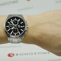 Циферблат лаконичного чёрного цвета имеет крупную индикацию времени и секундную стрелку с оранжевым наконечником, что обеспечивает идеальную читаемость показателей. Высокоточный кварцевый механизм заключён в стальной ударопрочный корпусУдаропрочный корпусМеханизм заключён в корпус, выполненный из современных материалов, устойчивых к ударам, механическим повреждениям и падению с высоты: инновационный пластик, карбон, нержавеющая сталь, титан., из нержавеющей стали выполнен и браслет. Минеральное стекло устойчиво к появлению царапин. Водонепроницаемость 100 метров. Люминесцентная подсветкаЛюминесцентное покрытиеПозволяет считывать показания времени в темноте. Производители наносят на стрелки, часовые индексы, безель или поверхность циферблата светонакопительный состав, дающий холодное свечение.. ХронографХронографФункция позволяет измерять отрезки времени с особой точностью: часы, минуты, секунды. Верным признаком хронографа является наличие на циферблате 3 дополнительных окошек-счётчиков., секундомер, календарь. Габариты: 44 x 50 x 12 мм.