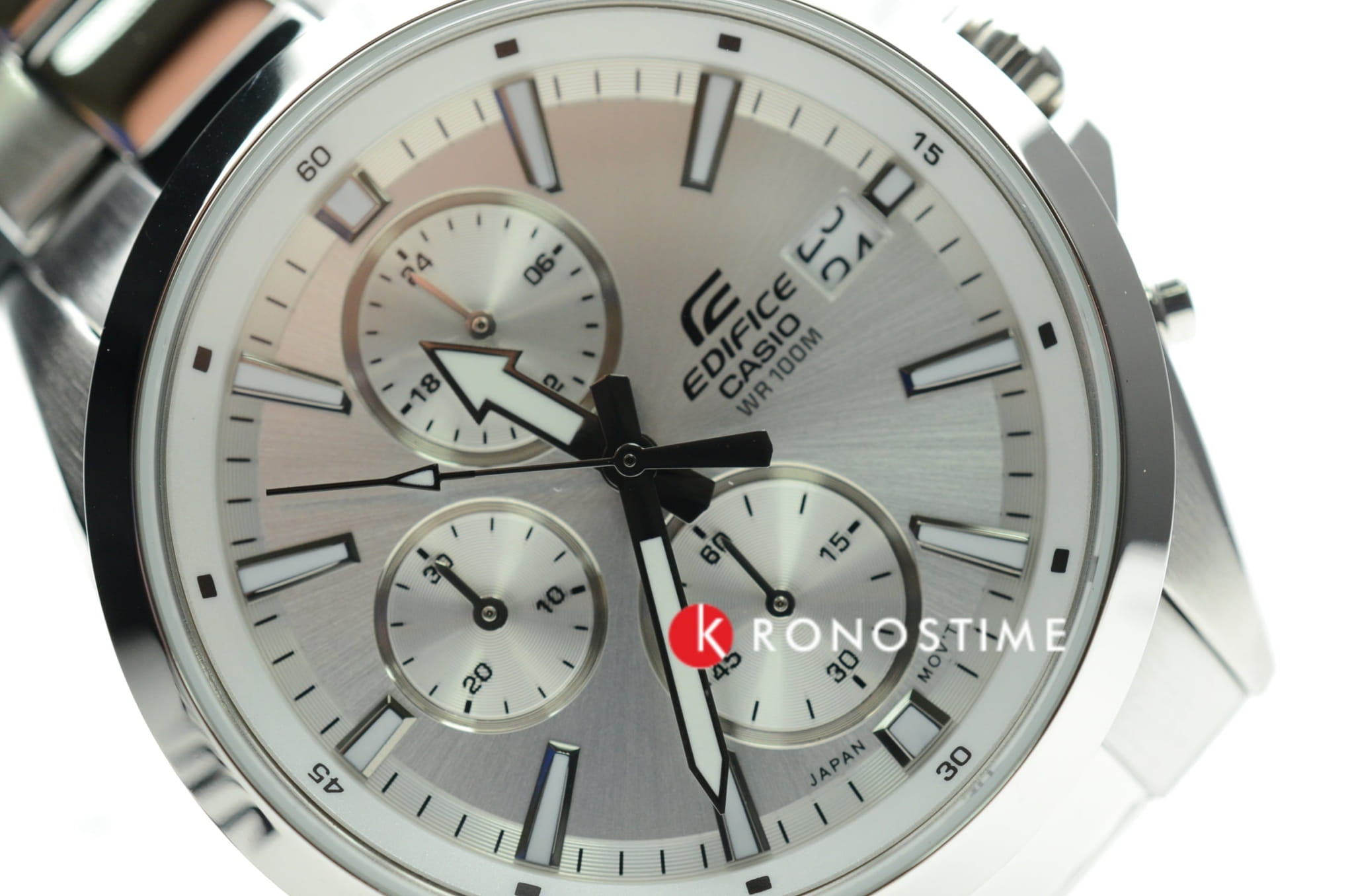 Циферблат лаконичного белого цвета имеет крупную индикацию времени и секундную стрелку с наконечником, что обеспечивает идеальную читаемость показателей. Высокоточный кварцевый механизм заключён в стальной ударопрочный корпусУдаропрочный корпусМеханизм заключён в корпус, выполненный из современных материалов, устойчивых к ударам, механическим повреждениям и падению с высоты: инновационный пластик, карбон, нержавеющая сталь, титан., из нержавеющей стали выполнен и браслет. Минеральное стекло устойчиво к появлению царапин. Водонепроницаемость 100 метров. Люминесцентная подсветкаЛюминесцентное покрытиеПозволяет считывать показания времени в темноте. Производители наносят на стрелки, часовые индексы, безель или поверхность циферблата светонакопительный состав, дающий холодное свечение.. ХронографХронографФункция позволяет измерять отрезки времени с особой точностью: часы, минуты, секунды. Верным признаком хронографа является наличие на циферблате 3 дополнительных окошек-счётчиков., секундомер, календарь. Габариты: 44 x 50 x 12 мм.