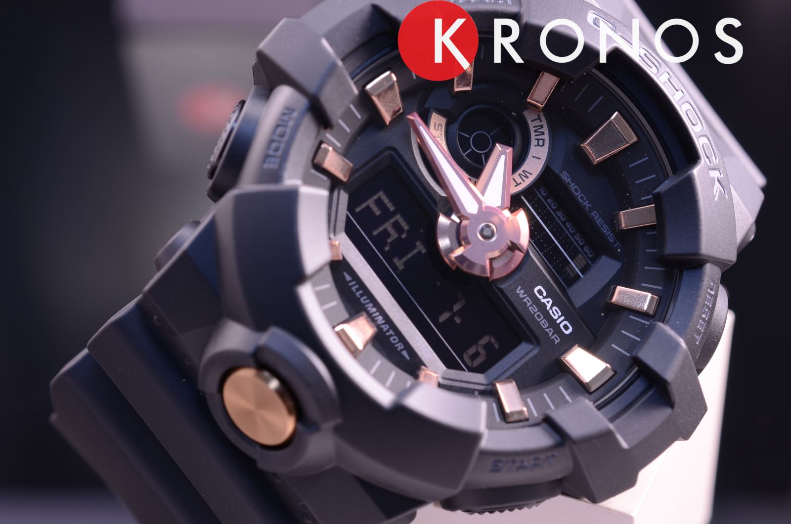 Стильный аксессуар чёрного цвета имеет привлекательные акценты в цвете розового золота, что смягчает его брутальный вид. Часы с крупными стрелками и метками обеспечивают идеальную читаемость показателей времени, кнопка подсветки для удобства вынесена в нижнюю часть ударопрочного корпусаУдаропрочный корпусМеханизм заключён в корпус, выполненный из современных материалов, устойчивых к ударам, механическим повреждениям и падению с высоты: инновационный пластик, карбон, нержавеющая сталь, титан.. Он, как и ремешок, выполнен из полимерного материала, выдерживающим удары и падения. Японский кварцевый механизм получает питание от батарейки, отличающейся повышенным сроком службы до 5 лет. Закаленное минеральное стекло. Яркая светодиодная подсветкаСветодиодная подсветкаСветодиодная или LED-подсветка обеспечивает появление яркого холодного свечения за счёт LED-элементов - маленьких лампочек. Они потребляют минимальное количество энергии, чаще всего можно встретить 1 светодиод, в нижней части циферблата.. Водозащита 200 метров. Функция перемещения стрелок для быстрого доступа к данным малых счётчиков. Таймер обратного отсчёта, UTCUTCВсемирное кординационное время, не имеющее привязки к географическому положению Гринвича, основывается на атомном отсчёте времени. Регулировка времени осуществляется более точно, чем устаревшее GMT.