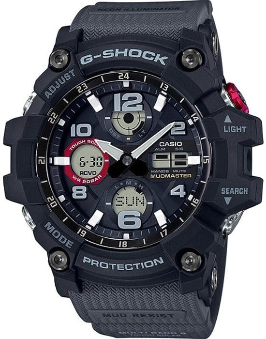 Наручные часы относятся к линейке Mudmaster, массивная модель с крупными деталями на вашем запястье точно не останется незамеченной. Ключевой особенностью стал герметичный ударопрочный корпусУдаропрочный корпусМеханизм заключён в корпус, выполненный из современных материалов, устойчивых к ударам, механическим повреждениям и падению с высоты: инновационный пластик, карбон, нержавеющая сталь, титан., способный препятствовать попаданию внутрь пыли, песка и грязи. Также ему не страшны вибрации, падение и удары. Это часы на солнечной батарее с технологией , время работы аккумулятора без подзарядки составляет 7 месяцев. Специальный индикатор позволяет следить за уровнем зарядки. Минеральное стекло. Двойная светодиодная подсветкаСветодиодная подсветкаСветодиодная или LED-подсветка обеспечивает появление яркого холодного свечения за счёт LED-элементов - маленьких лампочек. Они потребляют минимальное количество энергии, чаще всего можно встретить 1 светодиод, в нижней части циферблата. ЖК-дисплея и циферблата. Удобный полимерный ремешок. Стрелки с люминесцентной подсветкойЛюминесцентное покрытиеПозволяет считывать показания времени в темноте. Производители наносят на стрелки, часовые индексы, безель или поверхность циферблата светонакопительный состав, дающий холодное свечение.. Водостойкость 20 бар. Коррекция времени по радиосигналу, функция мирового времениМировое время Полезное часовое усложнение, отображающее время в основных городах и известных областях по всему миру, оно связано с часовыми поясами, удобно для путешественников и бизнесменов. , автоматический календарь, будильник, таймер, секундомер. Габариты: 56,2 x 54,9 x 17,3 мм.