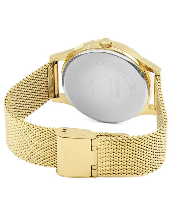 Стильный дизайн аксессуара выдержан в золотистом цвете. На браслет миланского плетения и корпус, сделанные из стали, нанесено защитное IP-покрытиеIP-покрытиеМетод ионного напыления. Демонстрирует повышенную устойчивость к истиранию, окислению и химическим веществам. Под воздействием высокого давления и температуры около 1500°C молекулы металла надёжно соединяются с частицами корпуса часов.. На круглом, черном циферблате расположены аккуратные временные отметки в виде штрихов. Защита часов от негативных воздействий обеспечивается минеральным стеклом. Благодаря кварцевому типу механизма отсутствует необходимость каждый раз заводить часы. Вес аксессуара составляет 60 грамм.