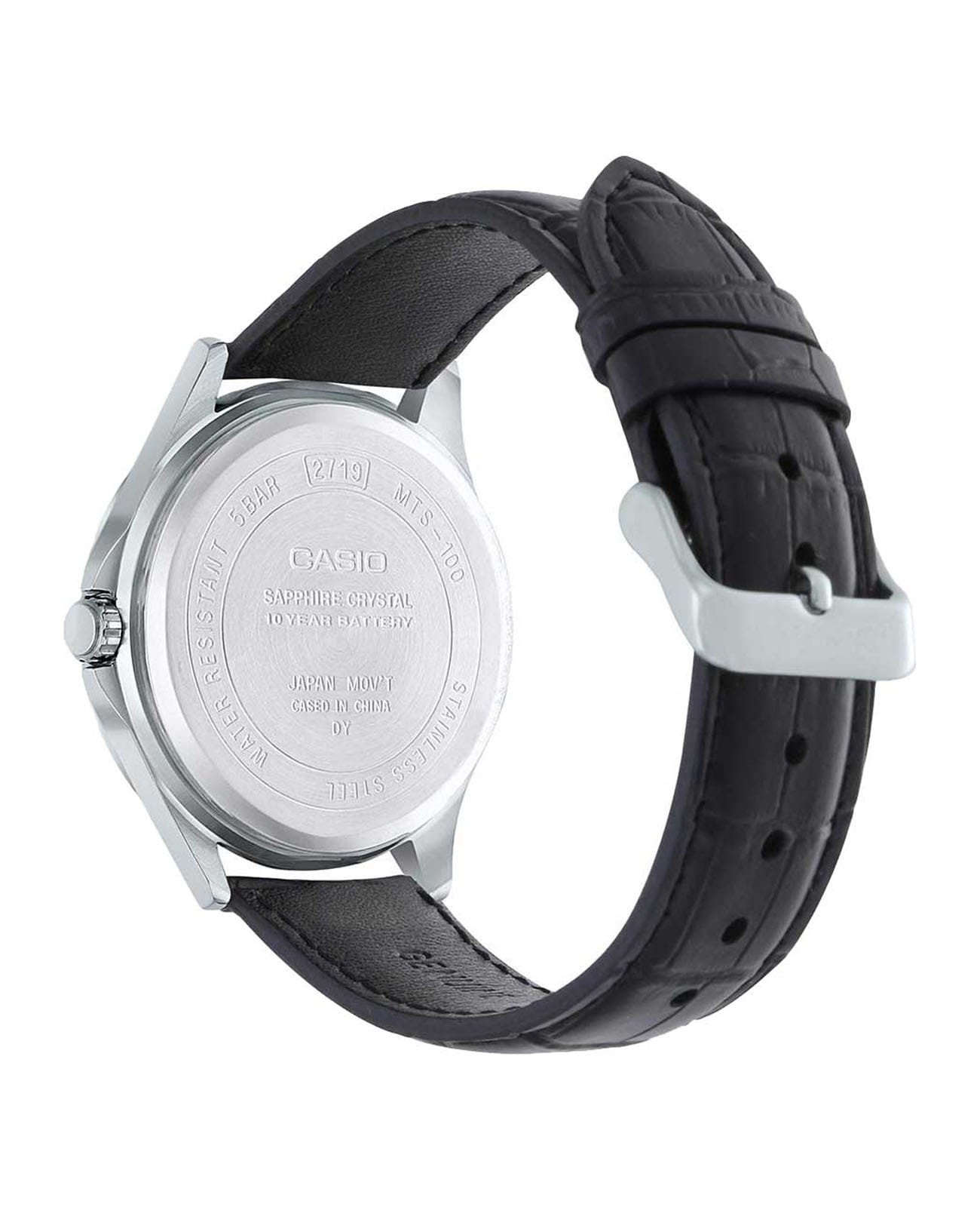 Японские мужские кварцевые часы с сапфировым стекломСапфировое стеклоПрочный и надёжный материал из кристалла сапфира синтетического происхождения, характеризующийся особой твёрдостью и устойчивостью к царапинам и повреждениям. Casio Collection MTS-100L-1A, кварцевый механизм с высокой точностью. Корпус часов изготовлен из нержавеющей. Подсветка NeobriteПодсветка NeobriteИспользование светонакопительных составов на основе сульфида цинка или алюмината стронция, яркий свет можно наблюдать на протяжении 6-10 часов после «зарядки» часов около источника света. обеспечивает длительное послесвечение в темноте даже после кратковременного нахождения на свету. Окошко даты находится в положении 3 часа. Батарея рассчитана на 10 лет. Заводная головка с защитой. Задняя крышка с винтовым фиксатором. Класс водозащиты: 50 метров, позволит защитить корпус от случайных брызг или капель дождя. Кожаный ремешок на стандартной застежке.