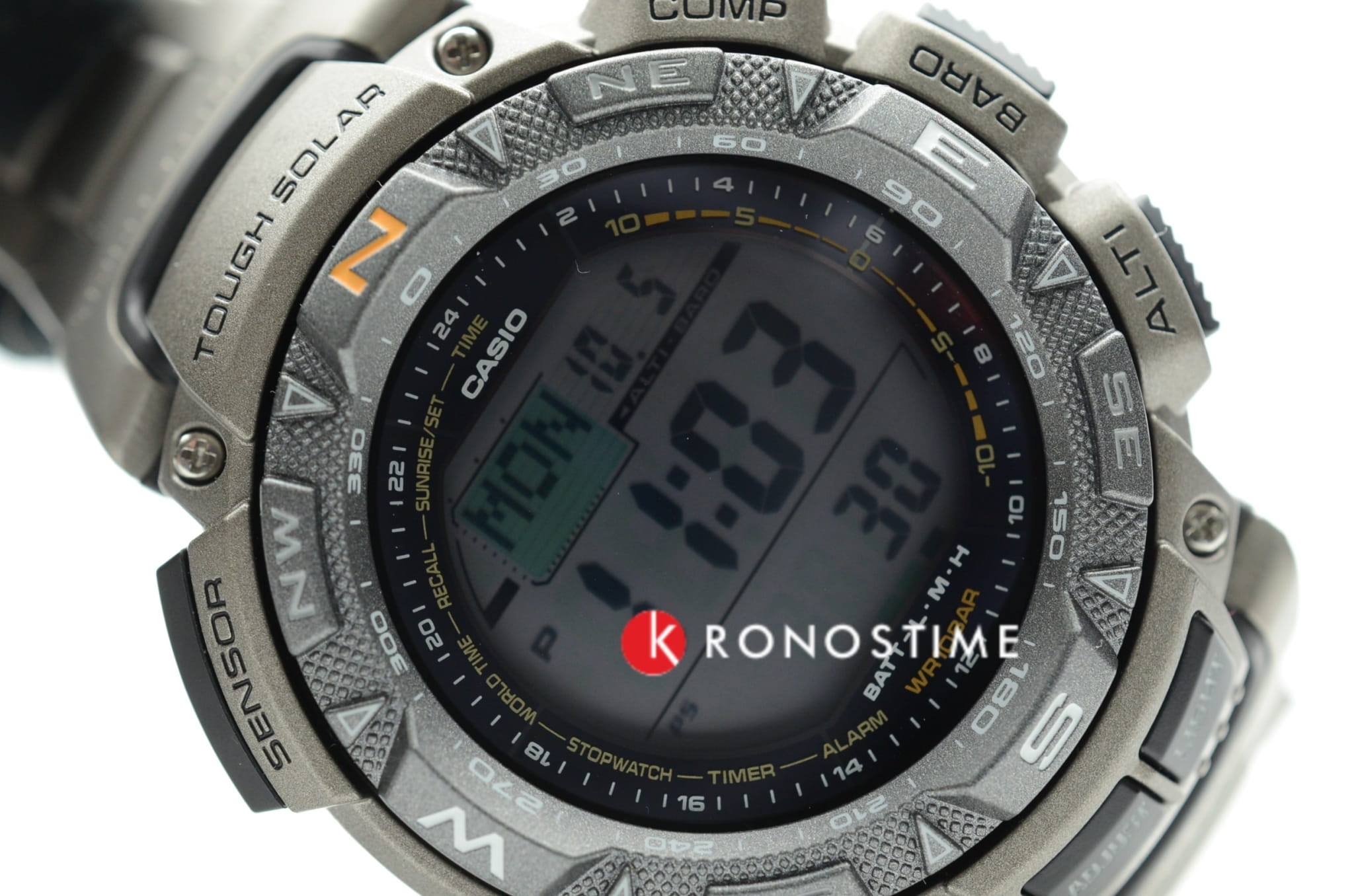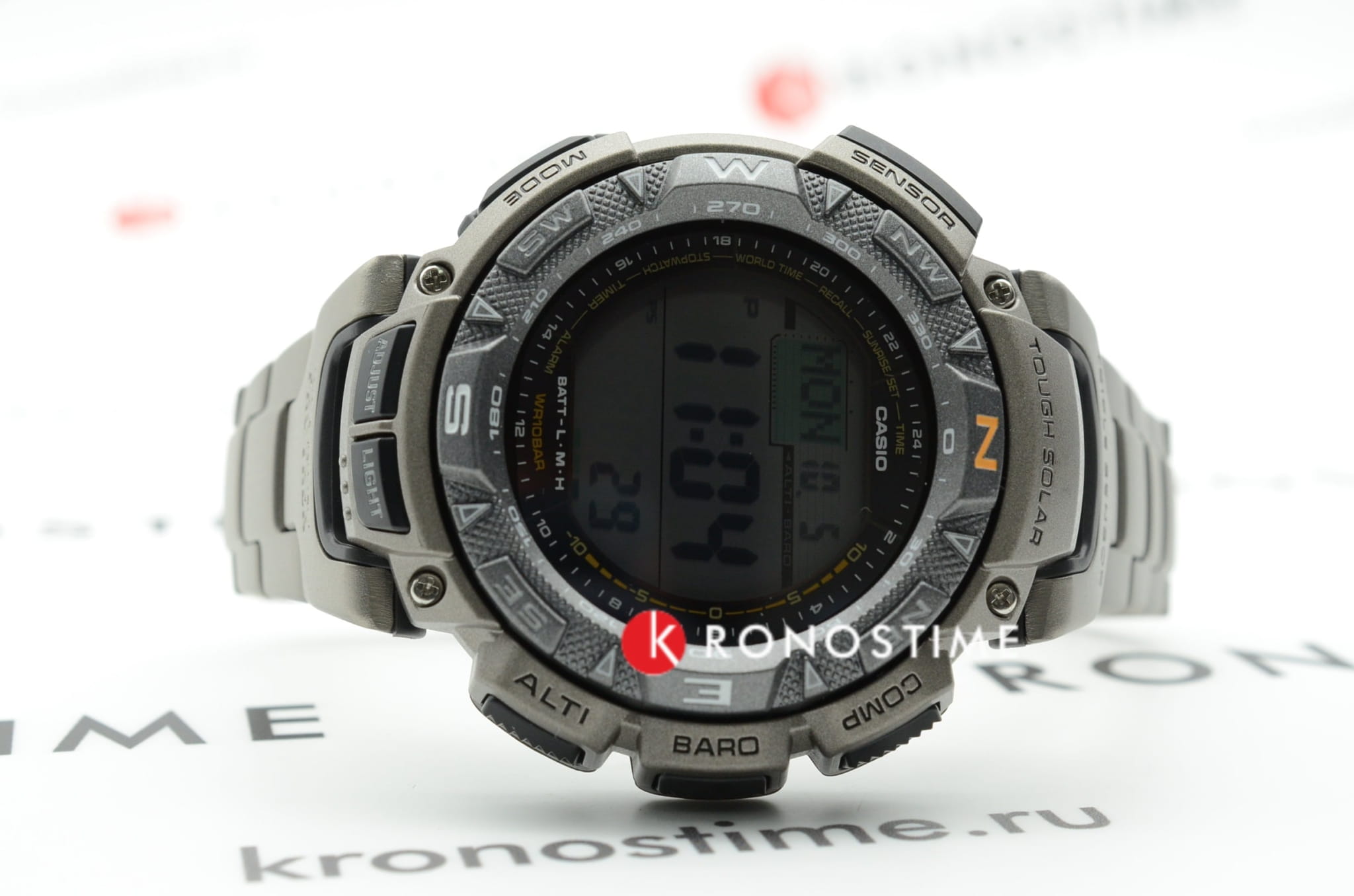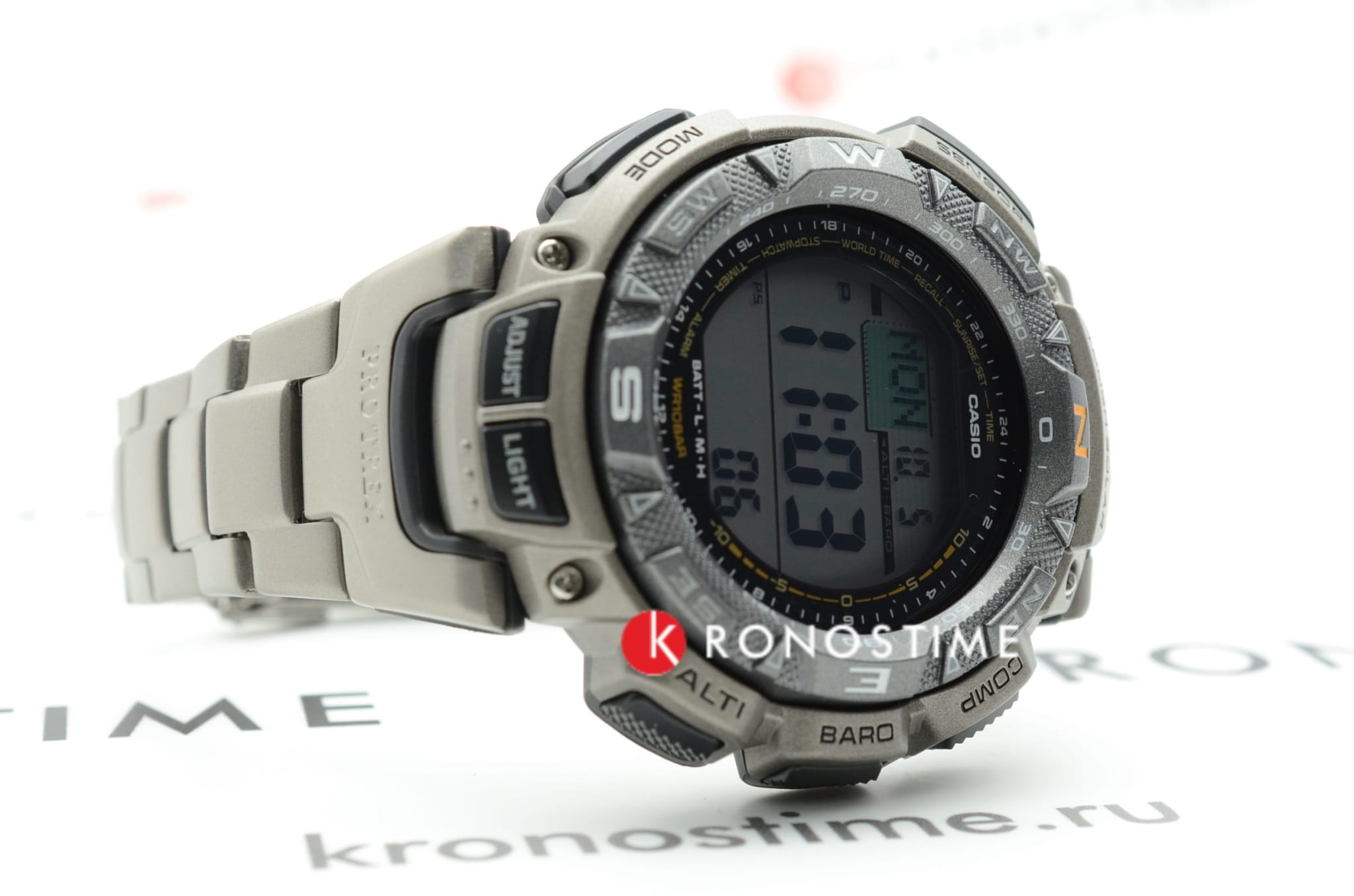 Функциональная модель в серебристой расцветке обладает расширенными возможностями. Каждое усложнение направляет усилия на то, чтобы ваше путешествие прошло легко и насыщенно. Среди функций компас, барометр, датчик температуры, мировое времяМировое время Полезное часовое усложнение, отображающее время в основных городах и известных областях по всему миру, оно связано с часовыми поясами, удобно для путешественников и бизнесменов. , отображение восхода и заката солнца, высотомер, таймер. Японский кварцевый механизм. Технология . Индикатор состояния заряда батареи. Электролюминесцентная подсветкаЭлектролюминесцентная подсветкаЭлектролюминесцентная панель устанавливается под ЖК-экраном часов, при нажатии кнопки электричество преобразуется в свет за счёт подачи напряжения на атомы фосфора, такой тип подсветки позволяет освещать весь циферблат. циферблата. Ударопрочный корпусУдаропрочный корпусМеханизм заключён в корпус, выполненный из современных материалов, устойчивых к ударам, механическим повреждениям и падению с высоты: инновационный пластик, карбон, нержавеющая сталь, титан. из полимерного материала. Титановый браслет. Вращающийся безельБезельВнешний ободок, закрепляющий стекло. В спортивных часах так называется поворотное кольцо с делениями на циферблате, выполняет роль таймера – замеряет отрезки времени на шкале. Неподвижный безель – элемент декора. Однонаправленно вращающийся безель на дайверских часах позволяет фиксировать моменты погружения и выныривания на поверхность.. Минеральное стекло. Водостойкость до 10 бар. Устойчивость к температуре ниже -10°C. Габариты: 57,3 x 50,9 x 15,3 мм.