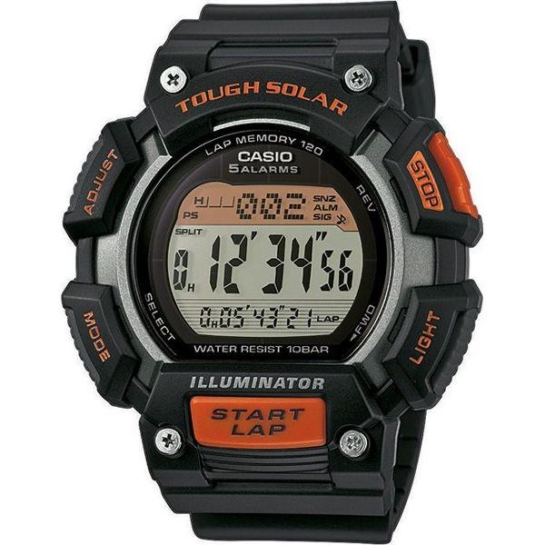 Спортивные мужские часы. Функция энергосбережения, полностью автоматический календарь, 5 будильников, функция snooze, индикатор уровня заряда батареи. Работают от солнечной энергии. Корпус - Пластиковый; Стекло - Пластик; Водозащита - 100 м. (WR 100); Материал ремешка - Пластиковый; Цвет ремешка - Черный; Цвет циферблата - Lcd.