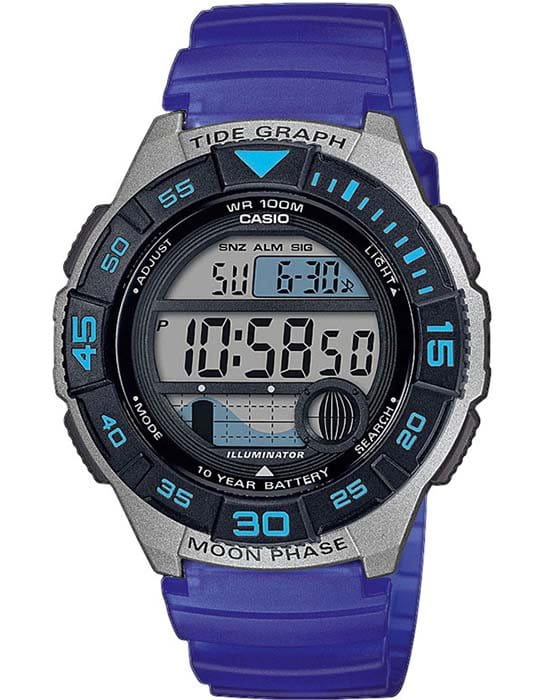 Электролюминесцентная подсветка освещает весь циферблат, после отпускания кнопки свечение продолжается еще некоторое время. Мировое время с дополнительным циферблатом, который позволяет настроить выбор места и времени второго часового пояса и при необходимости вывести на экран. Второй часовой пояс. 12-ти и 24-х часовой формат времени. Отображение возраста и фазы Луны. Графически отображаются сведения о приливах и отливах, основанные на широте и долготе. Секундомер с точностью показаний 1/100с и временем измерения 24ч. Сплит-хронограф. Таймер обратного отсчета от 1мин до 24ч с автоповтором. Безель вращается в одном направлении. Типы сигналов: ежедневный, ежемесячный, каждый день определенного месяца, на определенную дату. Функция включения/отключения звука.