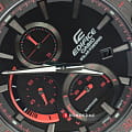 Наручные часы в чёрном исполнении привлекают красными деталями и лаконичным оформлением. Помогут идеально дополнить образ на каждый день. Аксессуар стал обладателем ультратонкого корпуса, по сравнению с большинством представителей Edifice – 9,9 мм. Модель изготовлена из стали 316L с ионным IP-покрытиемIP-покрытиеМетод ионного напыления. Демонстрирует повышенную устойчивость к истиранию, окислению и химическим веществам. Под воздействием высокого давления и температуры около 1500°C молекулы металла надёжно соединяются с частицами корпуса часов., материал устойчив к коррозии и механическим воздействиям. Японский кварцевый механизм обеспечивает питанием солнечная батарейка . Указатель минутной стрелки хронографаХронографФункция позволяет измерять отрезки времени с особой точностью: часы, минуты, секунды. Верным признаком хронографа является наличие на циферблате 3 дополнительных окошек-счётчиков. на секторной части циферблата. Сапфировое стекло с антибликовым покрытием. Водостойкость 100 метров. Люминесцентная подсветкаЛюминесцентное покрытиеПозволяет считывать показания времени в темноте. Производители наносят на стрелки, часовые индексы, безель или поверхность циферблата светонакопительный состав, дающий холодное свечение.. Застёжка с системой блокировки. Секундомер, отображение числа. Габариты: 50,2 x 45,4 x 9,9 мм.