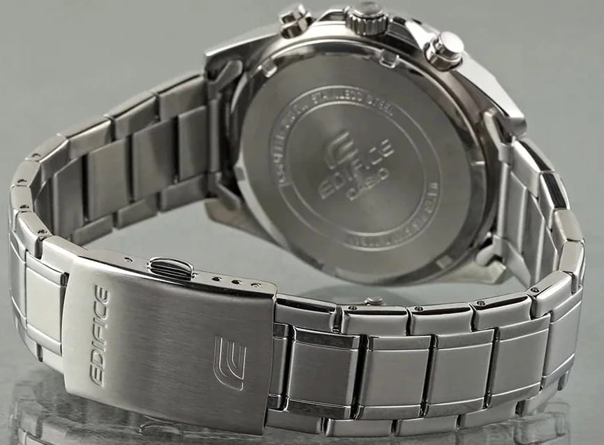 Японские мужские часы-хронографХронографФункция позволяет измерять отрезки времени с особой точностью: часы, минуты, секунды. Верным признаком хронографа является наличие на циферблате 3 дополнительных окошек-счётчиков. с секундомеромСекундомерСекундоме́р — прибор, способный измерять интервалы времени с точностью до долей секунды. Casio Edifice EFV-610D-5C, кварцевый механизм с высокой точностью. Класс водозащиты: 100 метров, позволит плавать, нырять и заниматься другими водными видами спорта. Корпус часов изготовлен из стали. Подсветка NeobriteПодсветка NeobriteИспользование светонакопительных составов на основе сульфида цинка или алюмината стронция, яркий свет можно наблюдать на протяжении 6-10 часов после «зарядки» часов около источника света. обеспечивает длительное послесвечение в темноте даже после кратковременного нахождения на свету. Часы-хронографХронографФункция позволяет измерять отрезки времени с особой точностью: часы, минуты, секунды. Верным признаком хронографа является наличие на циферблате 3 дополнительных окошек-счётчиков. с секундомеромСекундомерСекундоме́р — прибор, способный измерять интервалы времени с точностью до долей секунды. с точностью показаний 1/10с и временем измерения 1ч. Циферблат с метками в виде штрихов. Окошко даты находится в положении 3 часа. Задняя крышка с винтовым фиксатором. Батарея рассчитана на 3 года. Водонепроницаемость в соответствии с ISO 2281. Литой стальной браслет на раскладной застёжкеРаскладная застёжкаТакой тип застёжки используется только на браслетах из металла. Она никогда не раскрывается полностью, происходит разделение на 2 и более частей. Раскладывающая застёжка снизит вероятность потери часов к минимуму.. Предохранительная защелка на браслете препятствует случайному расстегиванию.