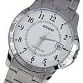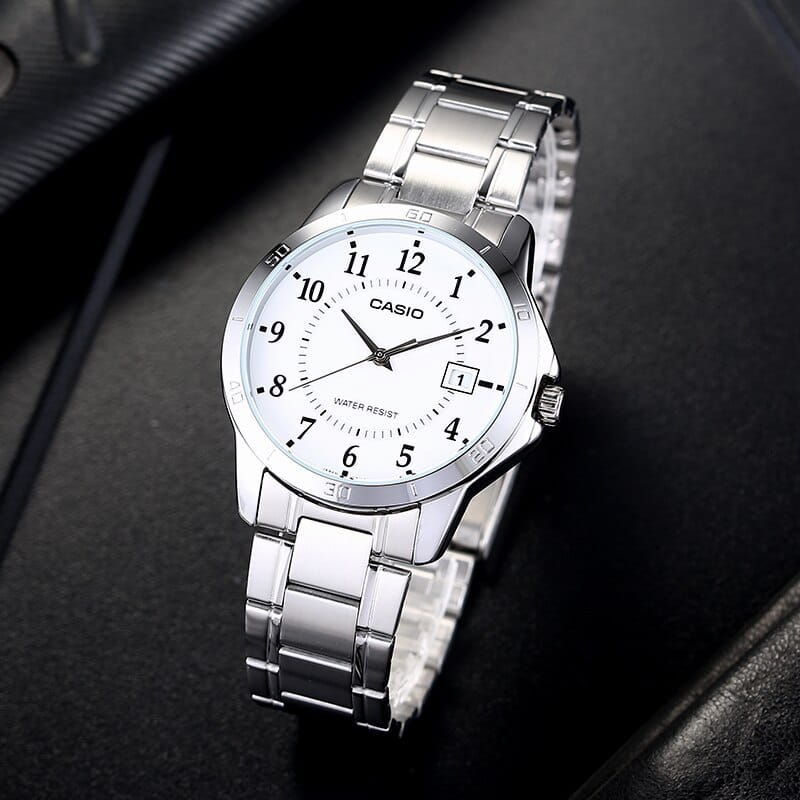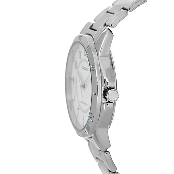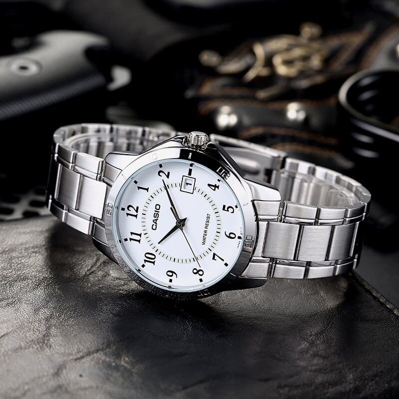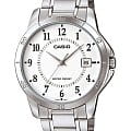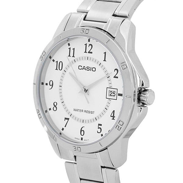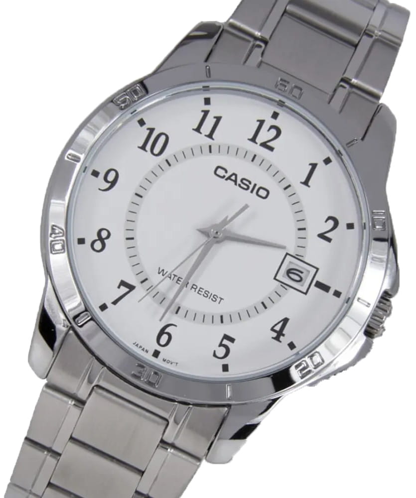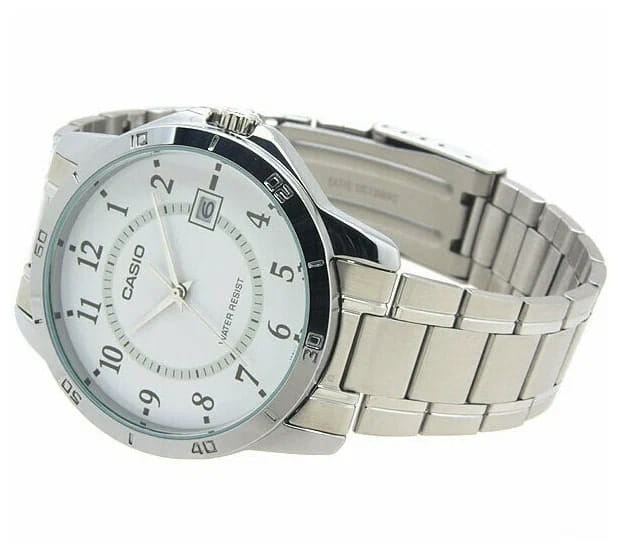 Японские мужские кварцевые часы с минеральным стекломМинеральное стеклоМинеральное стекло представляет собой искусственно выращенный минерал кварца. Такое стекло отличается особой устойчивостью к повреждениям и царапинам. Уступает по некоторым качествам сапфировому стеклу. Casio Collection MTP-V004D-7B, кварцевый механизм с высокой точностью. Класс водозащиты: 30 метров, позволит защитить корпус от случайных брызг или капель дождя. Корпус часов изготовлен из стали. Стальной браслет на раскладной застёжкеРаскладная застёжкаТакой тип застёжки используется только на браслетах из металла. Она никогда не раскрывается полностью, происходит разделение на 2 и более частей. Раскладывающая застёжка снизит вероятность потери часов к минимуму.. Окошко даты находится в положении 3 часа.