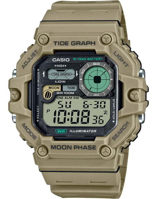 Многофункциональные часы Casio WS-1700H-5A с секундомеромСекундомерСекундоме́р — прибор, способный измерять интервалы времени с точностью до долей секунды. и таймеромТаймерОтсчитывает секунды в обратном направлении в заданном интервале времени. отлично подойдут для занятий спортом. Часы выдерживают давление до 10 АТМ и имеют впечатляющий срок службы батареи — около 10 лет. Используется батарея CR2025. Кварцевый механизм с высокой точностью. Модель оснащена двойным временем, секундомером с точностью до 1/100 секунды, таймером и мульти-будильником. Органическое стекло. Класс водозащиты: 100 метров, позволит плавать, нырять и заниматься другими водными видами спорта. Корпус из пластика. На ЖК-экране отображаются не только время и дата, но и дополнительная информация, такая как график приливов и отливов, данные о фазах Луны и аналоговое время. Добавлена светодиодная подсветкаСветодиодная подсветкаСветодиодная или LED-подсветка обеспечивает появление яркого холодного свечения за счёт LED-элементов - маленьких лампочек. Они потребляют минимальное количество энергии, чаще всего можно встретить 1 светодиод, в нижней части циферблата. янтарного цвета для улучшения видимости в темноте. Силикованный ремень с классической застежкой.