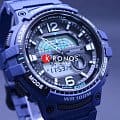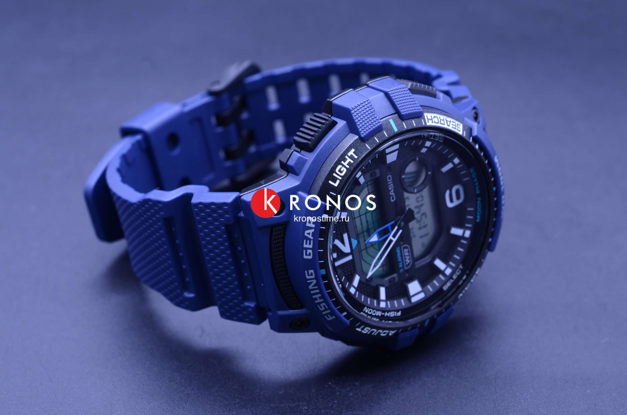 Аксессуар представлен в спортивном стиле. Синий полимерный ремешок имеет протекторную поверхность, боковые кнопки рифленые. В верхней части циферблата расположился индикатор рыбалки. Устройство поможет чётко рассчитать благоприятное время для рыбной ловли, в этот момент на экране появятся символы в виде рыбок. Корпус выполнен из полимерного пластика, материал устойчив к ударам, повреждениям. Японский кварцевый механизм. Батарейка рассчитана на 3 года работы. Акриловое стекло не повреждается при падении. Циферблат с оранжевой светодиодной подсветкойСветодиодная подсветкаСветодиодная или LED-подсветка обеспечивает появление яркого холодного свечения за счёт LED-элементов - маленьких лампочек. Они потребляют минимальное количество энергии, чаще всего можно встретить 1 светодиод, в нижней части циферблата.. Класс водостойкости WR 100. Отображение мирового времениМировое время Полезное часовое усложнение, отображающее время в основных городах и известных областях по всему миру, оно связано с часовыми поясами, удобно для путешественников и бизнесменов. . Будильник с функцией повтора, отображение лунных фаз, хронографХронографФункция позволяет измерять отрезки времени с особой точностью: часы, минуты, секунды. Верным признаком хронографа является наличие на циферблате 3 дополнительных окошек-счётчиков., таймер, вечный календарьВечный календарьКлассическое часовое усложнение, представляющее собой календарь, рассчитанный на несколько лет вперёд (стандартно – до 2099 года). Определяет текущую дату, день недели, месяц.. Габариты: 47,9 x 48,6 x 14 мм.
