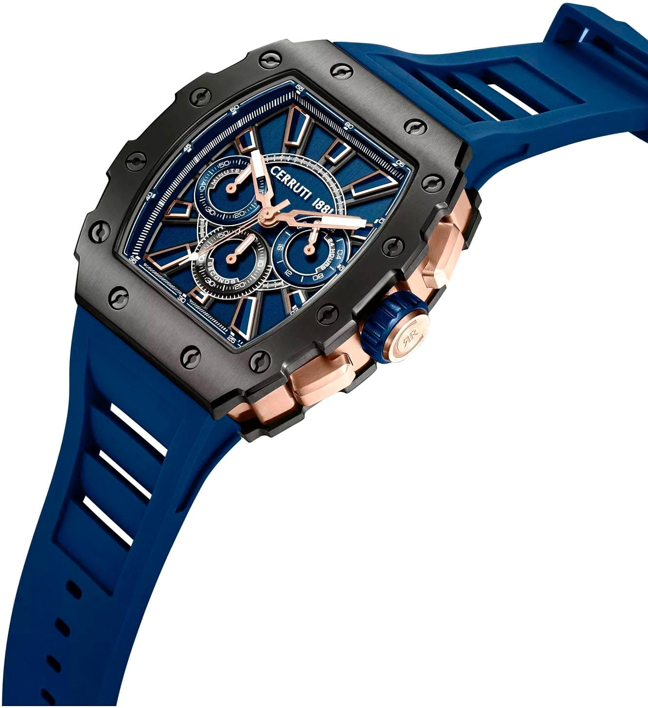 Cerruti 1881 CIWGO0085402 — выразительные мужские часы с эффектным спортивно-архитектурным дизайном, воплощающие энергетику современного мегаполиса. Корпус из нержавеющей стали с матовым PVD-покрытиемPVDУльтратонкое покрытие наносится в технике вакуумного напыления, сочетает в себе нитрид титана особой прочности со слоем золота или оксида хрома. Несёт в себе декоративную или защитную функцию. и мощным шестигранным безелемБезельВнешний ободок, закрепляющий стекло. В спортивных часах так называется поворотное кольцо с делениями на циферблате, выполняет роль таймера – замеряет отрезки времени на шкале. Неподвижный безель – элемент декора. Однонаправленно вращающийся безель на дайверских часах позволяет фиксировать моменты погружения и выныривания на поверхность. придаёт модели брутальный, технологичный облик. Глубокий циферблат украшен тремя счётчиками хронографаХронографФункция позволяет измерять отрезки времени с особой точностью: часы, минуты, секунды. Верным признаком хронографа является наличие на циферблате 3 дополнительных окошек-счётчиков., выделенными акцентами тёплого золотистого тона, создающими изысканный контраст. Широкие стрелки и метки с люминесцентным покрытиемЛюминесцентное покрытиеПозволяет считывать показания времени в темноте. Производители наносят на стрелки, часовые индексы, безель или поверхность циферблата светонакопительный состав, дающий холодное свечение. обеспечивают отличную читаемость при любом освещении, а надёжное минеральное стеклоМинеральное стеклоМинеральное стекло представляет собой искусственно выращенный минерал кварца. Такое стекло отличается особой устойчивостью к повреждениям и царапинам. Уступает по некоторым качествам сапфировому стеклу. защищает циферблат от повреждений. Эластичный силиконовый ремешок дополняет современную палитру корпуса и обеспечивает комфорт при ежедневном ношении. Cerruti 1881 — гармоничное соединение итальянской утончённости, функциональности и уверенного мужского стиля.