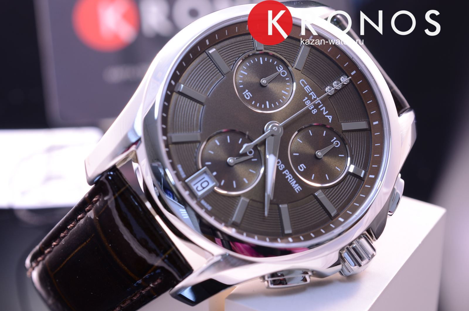 На метке 12 часов размещено 3 бриллианта оттенка Top Wesselton. ХронографХронографФункция позволяет измерять отрезки времени с особой точностью: часы, минуты, секунды. Верным признаком хронографа является наличие на циферблате 3 дополнительных окошек-счётчиков. характеризуется высокой точностью хода благодаря швейцарскому кварцевому механизму ETA G10.211. Ремешок выполнен из натуральной кожи, сапфировое стекло отличается антибликовой обработкой.
