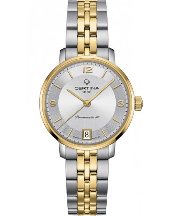 Модель работает за счёт швейцарского автоматического калибра Powermatic 80Powermatic 80Эксклюзивный калибр от швейцарской компании ETA с увеличенным запасом хода до 80 часов за счёт удлинённой заводной пружины. Характеризуется улучшенной системой спуска со сниженным трением. с 80-часовым резервом хода. Повышенную ударопрочность и водостойкость WR 100 обеспечивает система DS ConceptDS ConceptDouble Security Concept, обозначает двойную надёжность и безупречную точность часов Certina. Двойная система защиты подразумевает обеспечение максимальной устойчивости к ударам и высоких показателей водонепроницаемости.. Золотистое PVD-покрытиеPVDУльтратонкое покрытие наносится в технике вакуумного напыления, сочетает в себе нитрид титана особой прочности со слоем золота или оксида хрома. Несёт в себе декоративную или защитную функцию.. Апертура даты.