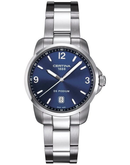 Наручные часы с синим циферблатом выполнены в спортивном стиле, серебристая расцветка останется актуальной на долгие годы. Модель сделана из нержавеющей стали 316L, материал отличается ударопрочностью и стойко защищает швейцарский кварцевый калибр ETA F06.111. Сапфировое стекло с антибликовой обработкой. Система DS ConceptDS ConceptDouble Security Concept, обозначает двойную надёжность и безупречную точность часов Certina. Двойная система защиты подразумевает обеспечение максимальной устойчивости к ударам и высоких показателей водонепроницаемости.. Стрелки и индексы с люминесцентным покрытиемЛюминесцентное покрытиеПозволяет считывать показания времени в темноте. Производители наносят на стрелки, часовые индексы, безель или поверхность циферблата светонакопительный состав, дающий холодное свечение.. Водостойкость WR 100. . Отображение текущей даты. Диаметр корпуса: 38 мм.