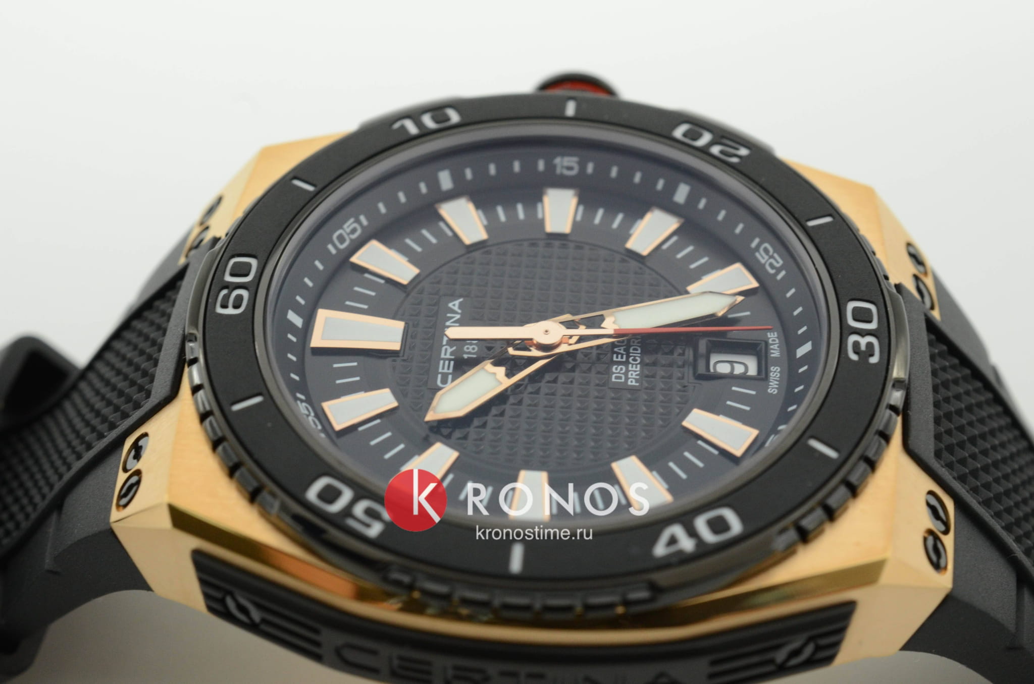 Аксессуар в спортивном стиле оснащён швейцарским кварцевым калибром ETA F07.411 Precidrive™Precidrive™Инновационный кварцевый механизм Certina. Часы, оснащённые этим швейцарским калибром, приравниваются к точности к сертифицированным хронометрам, точность хода составляет +/-10 секунд в год.. Часы основаны на концепции Двойной Надёжности DS ConceptDS ConceptDouble Security Concept, обозначает двойную надёжность и безупречную точность часов Certina. Двойная система защиты подразумевает обеспечение максимальной устойчивости к ударам и высоких показателей водонепроницаемости.. Стальной корпус защищён PVD-покрытиемPVDУльтратонкое покрытие наносится в технике вакуумного напыления, сочетает в себе нитрид титана особой прочности со слоем золота или оксида хрома. Несёт в себе декоративную или защитную функцию. золотистого цвета. Ремешок сделан из прочного, надёжного каучука.