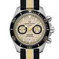 Коллекция DS Action открывает новые «глубины» часового искусства в прямом смысле этого слова: эти «морские» часы в стиле унисекс отличаются точностью, исключительной водостойкостью и динамичным дизайном – идеальный выбор для любой ситуации. Швейцарские мужские механические часы Certina DS Action Diver Chrono C032.827.18.271.00 из коллекции DS Action – безупречно точный и впечатляюще надёжный аксессуар. Габаритный хронографХронографФункция позволяет измерять отрезки времени с особой точностью: часы, минуты, секунды. Верным признаком хронографа является наличие на циферблате 3 дополнительных окошек-счётчиков. с бежевым циферблатом выгодно подчеркнёт повседневный или деловой образ. Модель соответствует стандарту ISO 6425 для дайверских часов и может похвастаться повышенной водостойкостью до 30 бар. Заводная головка, кнопки и задняя крышка завинчиваются для дополнительной герметичности. Аксессуар позволит вам чувствовать себя на высоте и в воде, и на суше. Сапфировое стеклоСапфировое стеклоПрочный и надёжный материал из кристалла сапфира синтетического происхождения, характеризующийся особой твёрдостью и устойчивостью к царапинам и повреждениям. с двухсторонней антибликовой обработкой. Керамический вращающийся безельБезельВнешний ободок, закрепляющий стекло. В спортивных часах так называется поворотное кольцо с делениями на циферблате, выполняет роль таймера – замеряет отрезки времени на шкале. Неподвижный безель – элемент декора. Однонаправленно вращающийся безель на дайверских часах позволяет фиксировать моменты погружения и выныривания на поверхность.. Корпус из нержавеющей стали 316L. Люминесцентная подсветкаЛюминесцентное покрытиеПозволяет считывать показания времени в темноте. Производители наносят на стрелки, часовые индексы, безель или поверхность циферблата светонакопительный состав, дающий холодное свечение.. Календарь, секундомер. Тканевый ремешок. Диаметр корпуса: 44,6 мм. Производство и сборка: Швейцария.