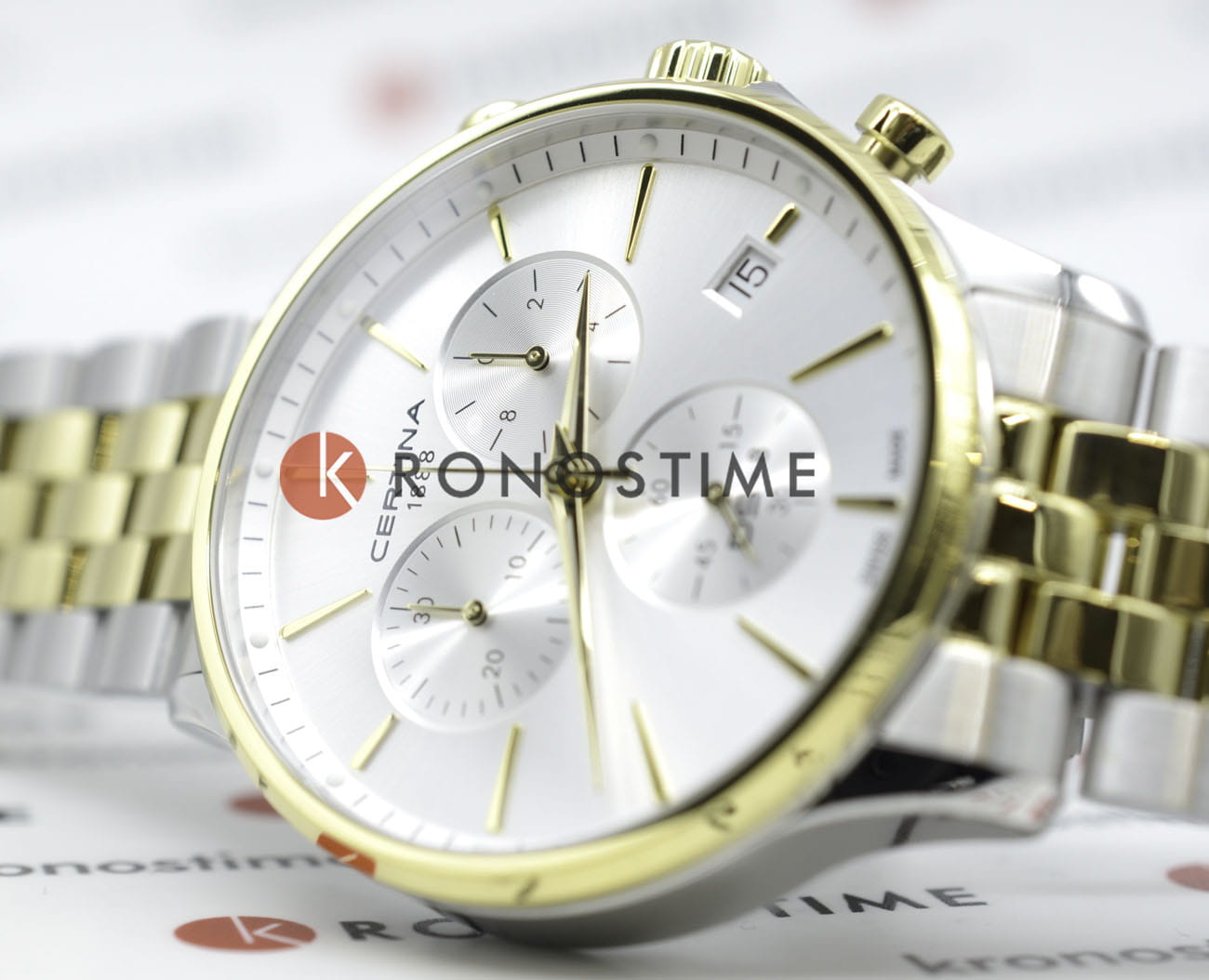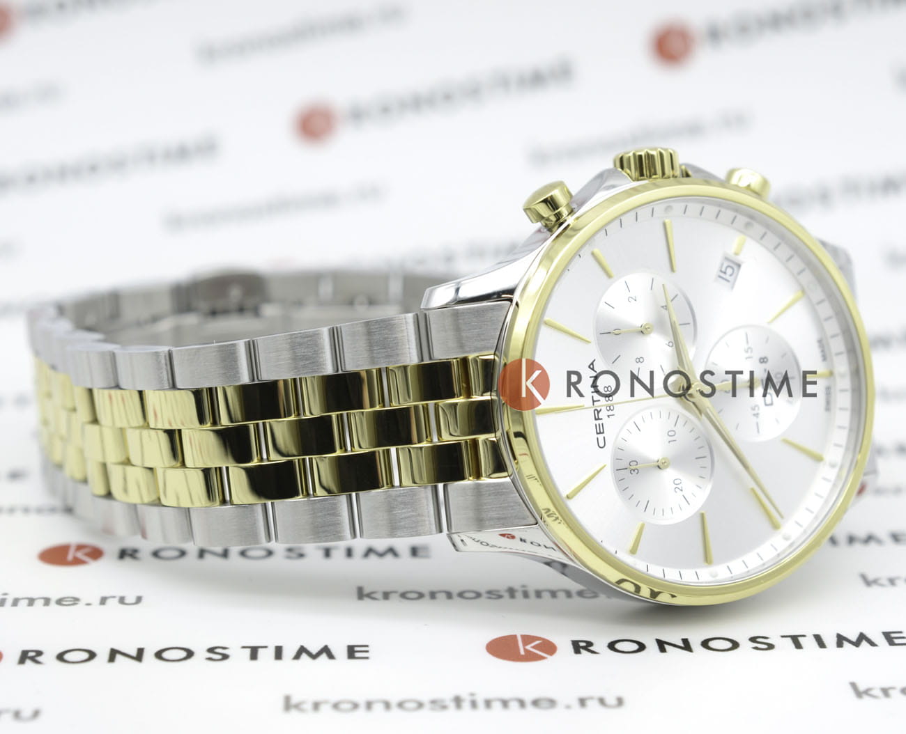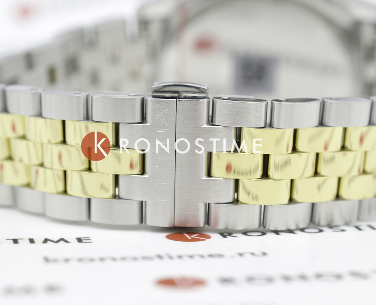 Высокая точность хода швейцарского кварцевого калибра ETA G15.212 AA Precidrive™Precidrive™Инновационный кварцевый механизм Certina. Часы, оснащённые этим швейцарским калибром, приравниваются к точности к сертифицированным хронометрам, точность хода составляет +/-10 секунд в год. отмечена сертификатом COSCСертификат COSCОфициальный сертификат, подтверждающий то, что часы ходят с особо высокой точностью. Для получения документа часы подвергаются тестовым испытаниям, разработанным швейцарским институтом тестирования хронометров COSC. Допустимая норма для механических часов -4/+6 секунд в день, для кварцевых моделей +/- 0,07 секунд в день.. Сапфировое стеклоСапфировое стеклоПрочный и надёжный материал из кристалла сапфира синтетического происхождения, характеризующийся особой твёрдостью и устойчивостью к царапинам и повреждениям. с покрытием «антиблик». ХронографХронографФункция позволяет измерять отрезки времени с особой точностью: часы, минуты, секунды. Верным признаком хронографа является наличие на циферблате 3 дополнительных окошек-счётчиков., секундомер, дата, EOLEOLПредставляет собой систему, уведомляющую владельца часов о необходимости замены элемента питания. За 2 недели до полного разряда батарейки секундная стрелка перестаёт ходить чётко и начинает перепрыгивать на 3-4 деления.. Концепция Двойной Надёжности DSDS ConceptDouble Security Concept, обозначает двойную надёжность и безупречную точность часов Certina. Двойная система защиты подразумевает обеспечение максимальной устойчивости к ударам и высоких показателей водонепроницаемости.. Стрелки с люминесцентным покрытиемЛюминесцентное покрытиеПозволяет считывать показания времени в темноте. Производители наносят на стрелки, часовые индексы, безель или поверхность циферблата светонакопительный состав, дающий холодное свечение.. Стальной браслет на застёжке-бабочке с кнопкамиЗастёжка "бабочка"Такой вид застёжки дополняется предохранителями, помогающими избежать случайного раскрытия браслета. Обладают изящным исполнением. .