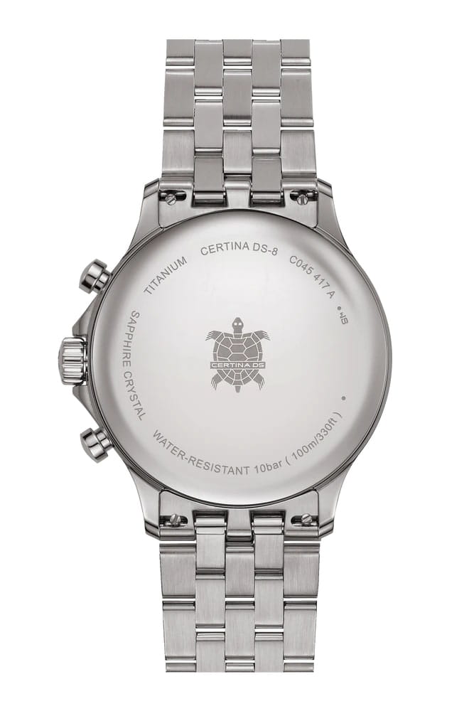 Высокий уровень точности хода обеспечен швейцарским кварцевым калибром ETA G15.212 AA Precidrive™Precidrive™Инновационный кварцевый механизм Certina. Часы, оснащённые этим швейцарским калибром, приравниваются к точности к сертифицированным хронометрам, точность хода составляет +/-10 секунд в год., сертифицированным по стандарту COSC. Сапфировое стеклоСапфировое стеклоПрочный и надёжный материал из кристалла сапфира синтетического происхождения, характеризующийся особой твёрдостью и устойчивостью к царапинам и повреждениям. с антибликовым покрытием обеспечивает кристально чистое видение. Функции включают хронограф, секундомер, индикатор даты и сигнал конца заряда (EOL). Технология Double Security (DS Concept) обеспечивает дополнительную надежность конструкции. Ремешок из нержавеющей стали закреплён на застёжке-бабочке с кнопками.