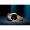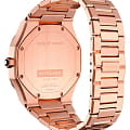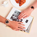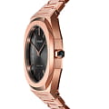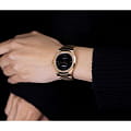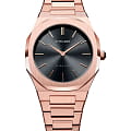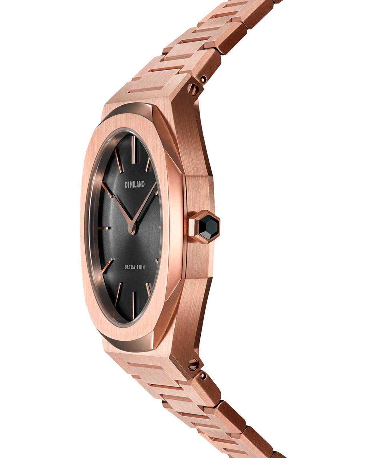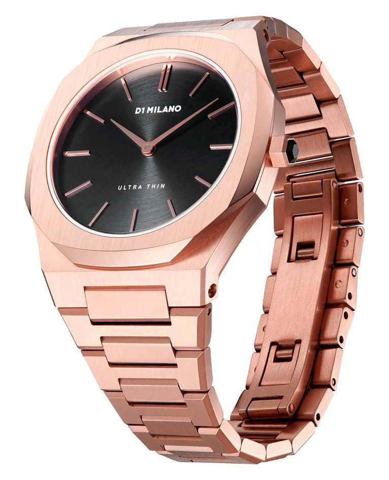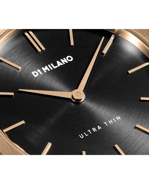 Женские наручные часы D1 Milano UTBL06 из коллекции Ultra Thin сочетают в себе элегантный дизайн и современные технологии. Модель обладает круглым корпусом диаметром 34 мм, изготовленным из нержавеющей стали с PVD-покрытиемPVDУльтратонкое покрытие наносится в технике вакуумного напыления, сочетает в себе нитрид титана особой прочности со слоем золота или оксида хрома. Несёт в себе декоративную или защитную функцию. в розовом золоте, что обеспечивает устойчивость к внешним воздействиям. Толщина ультратонкого корпуса составляет всего 6 мм, делая аксессуар легким и удобным для повседневного использования. Браслет также выполнен из того же материала с раскладной застежкойРаскладной замокДанный вариант застежки используется только на часах с металлическим браслетом. Отличительная особенность такого крепления в том, что длина браслета становится универсальной и вы можете самостоятельно отрегулировать нужный вам размер – застежка просто двигается по браслету часов., гарантирующей комфортное ношение и безопасность. Черный циферблат украшен метками в виде штрихов и оснащен стрелочным механизмом в тон корпуса, который подчеркивает элегантность модели. Для защиты используется сапфировое стеклоСапфировое стеклоПрочный и надёжный материал из кристалла сапфира синтетического происхождения, характеризующийся особой твёрдостью и устойчивостью к царапинам и повреждениям., обеспечивающее прочную защиту от царапин и бликов. Часы работают на кварцевом механизме, гарантирующем точность хода без необходимости регулярного подзавода. Водонепроницаемость часов достигает 5 атмосфер (50 метров), что позволяет использовать их во время мытья рук или плавания, однако не рекомендуется для глубоководного дайвинга.