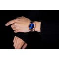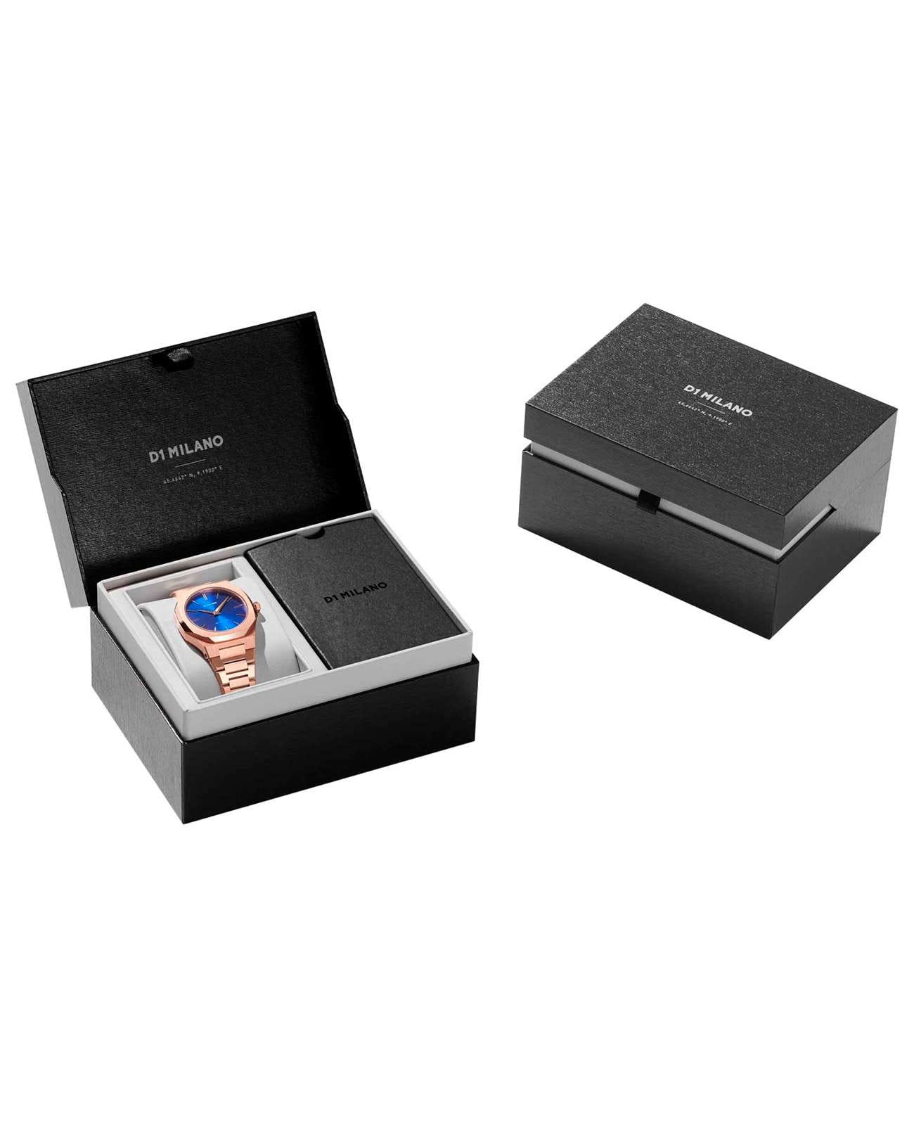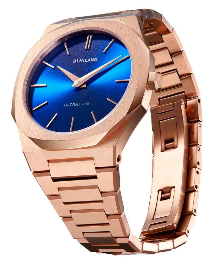 Женские наручные часы D1 Milano UTBL12 из коллекции Ultra Thin сочетают в себе элегантный дизайн и современные технологии. Модель обладает круглым корпусом диаметром 34 мм, изготовленным из высококачественной нержавеющей стали 316L с PVD-покрытиемPVDУльтратонкое покрытие наносится в технике вакуумного напыления, сочетает в себе нитрид титана особой прочности со слоем золота или оксида хрома. Несёт в себе декоративную или защитную функцию.. Толщина ультратонкого корпуса составляет всего 6 мм, делая аксессуар легким и удобным для повседневного использования. Браслет также выполнен из нержавеющей стали с PVD-покрытиемPVDУльтратонкое покрытие наносится в технике вакуумного напыления, сочетает в себе нитрид титана особой прочности со слоем золота или оксида хрома. Несёт в себе декоративную или защитную функцию. и с раскладной застежкойРаскладной замокДанный вариант застежки используется только на часах с металлическим браслетом. Отличительная особенность такого крепления в том, что длина браслета становится универсальной и вы можете самостоятельно отрегулировать нужный вам размер – застежка просто двигается по браслету часов., гарантирующей комфортное ношение и безопасность. Синий циферблат с эффектом Sunray украшен метками в виде штрихов и оснащен стрелочным механизмом, который подчеркивает элегантность модели. Для защиты используется сапфировое стеклоСапфировое стеклоПрочный и надёжный материал из кристалла сапфира синтетического происхождения, характеризующийся особой твёрдостью и устойчивостью к царапинам и повреждениям. с антибликовым покрытиемАнтибликовое покрытиеСлой оксида металла в 0,13-0,3 микрон, благодаря которому стекло часов не бликует и не отражает свет. Антибликовое покрытие уменьшает отражение света в 10 раз, обеспечивая отличную читаемость показателей циферблата., обеспечивающее прочную защиту от царапин и бликов. Часы работают на кварцевом механизме Miyota, гарантирующем точность хода без необходимости регулярного подзавода. Водонепроницаемость часов достигает 5 атмосфер (50 метров), что позволяет использовать их во время мытья рук или плавания, однако не рекомендуется для глубоководного дайвинга.