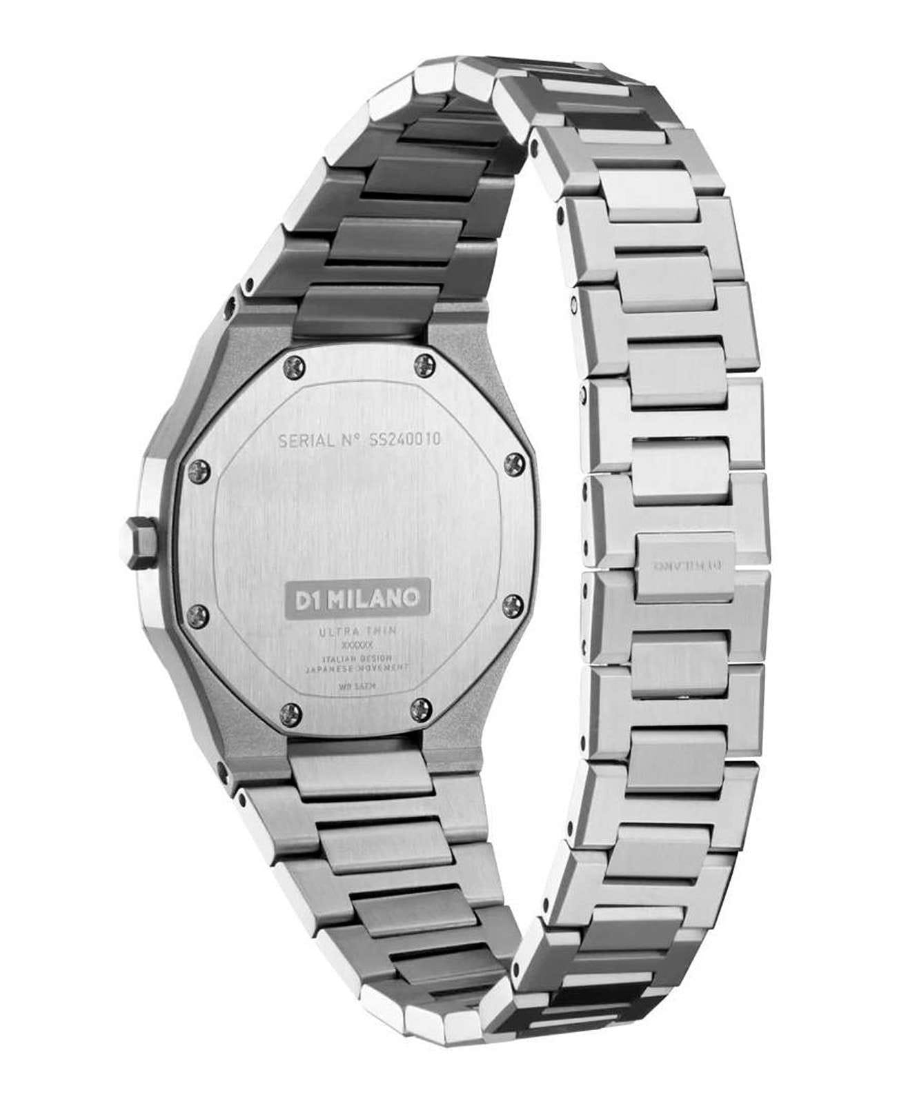 Наручные часы D1 Milano UTBL30 из коллекции Ultra Thin сочетают в себе элегантный дизайн и современные технологии. Модель обладает круглым корпусом диаметром 30 мм, изготовленным из нержавеющей стали с вертикальной шлифовкой, что обеспечивает высокую устойчивость к внешним воздействиям. Для защиты циферблата используется сапфировое стеклоСапфировое стеклоПрочный и надёжный материал из кристалла сапфира синтетического происхождения, характеризующийся особой твёрдостью и устойчивостью к царапинам и повреждениям. с антибликовым покрытиемАнтибликовое покрытиеСлой оксида металла в 0,13-0,3 микрон, благодаря которому стекло часов не бликует и не отражает свет. Антибликовое покрытие уменьшает отражение света в 10 раз, обеспечивая отличную читаемость показателей циферблата., которое эффективно противостоит царапинам и механическим повреждениям. Часы оснащены кварцевым механизмом Miyota 1L22, гарантирующим точное время без необходимости подзаводки. Водонепроницаемость модели достигает 5 атмосфер (50 метров), что позволяет использовать их при контакте с водой, например, во время мытья рук или дождя. Браслет выполнен из нержавеющей стали с раскладной застежкой с кнопкойРаскладной замокДанный вариант застежки используется только на часах с металлическим браслетом. Отличительная особенность такого крепления в том, что длина браслета становится универсальной и вы можете самостоятельно отрегулировать нужный вам размер – застежка просто двигается по браслету часов., обеспечивающей комфортное ношение и безопасность. Циферблат серебристого цвета с узором Sunray (Soleil) придает часам особую изысканность и делает их идеальным выбором для повседневного использования или особых случаев.