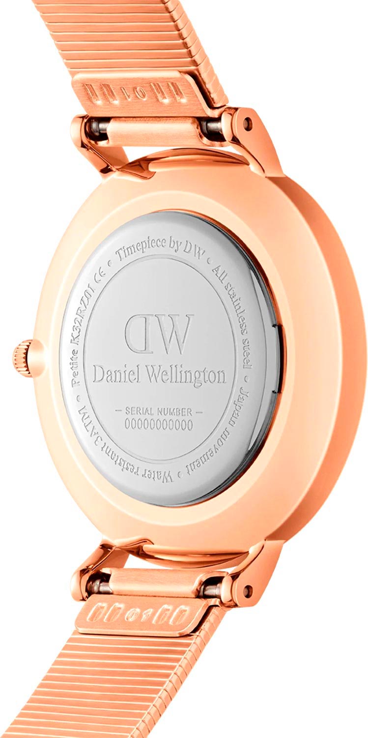 Женские наручные часы с минеральным стекломМинеральное стеклоМинеральное стекло представляет собой искусственно выращенный минерал кварца. Такое стекло отличается особой устойчивостью к повреждениям и царапинам. Уступает по некоторым качествам сапфировому стеклу. Daniel Wellington Petite Lumine Pressed Melrose DW00100590, кварцевый механизм с высокой точностью. Класс водозащиты: 30 метров, позволит защитить корпус от случайных брызг или капель дождя. Корпус часов изготовлен из стали с PVD-покрытиемPVDУльтратонкое покрытие наносится в технике вакуумного напыления, сочетает в себе нитрид титана особой прочности со слоем золота или оксида хрома. Несёт в себе декоративную или защитную функцию.. Стальной браслет на раскладной застёжкеРаскладная застёжкаТакой тип застёжки используется только на браслетах из металла. Она никогда не раскрывается полностью, происходит разделение на 2 и более частей. Раскладывающая застёжка снизит вероятность потери часов к минимуму. с PVD-покрытиемPVDУльтратонкое покрытие наносится в технике вакуумного напыления, сочетает в себе нитрид титана особой прочности со слоем золота или оксида хрома. Несёт в себе декоративную или защитную функцию..