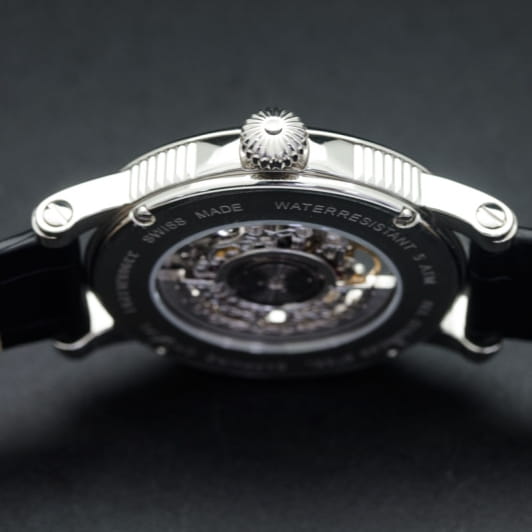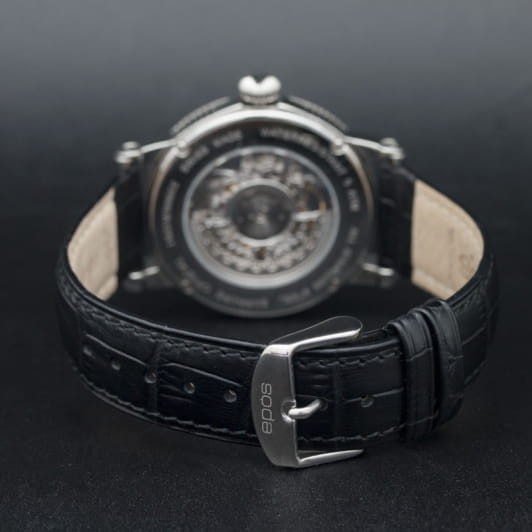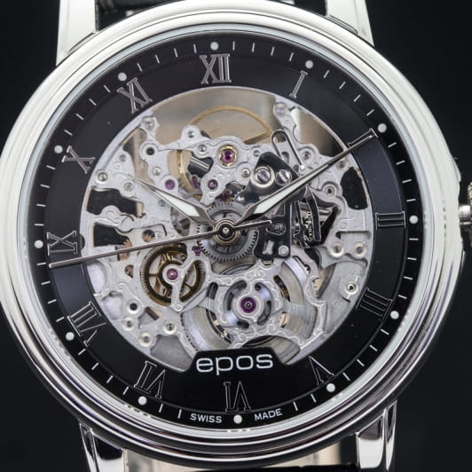 Мужские механические часы с автоподзаводом Epos — это сочетание швейцарского мастерства и современного дизайна. Корпус диаметром 41 мм выполнен из нержавеющей стали 316L. Циферблат чёрного цвета частично скелетонизирован, оформлен римскими цифрами и дополнен гильошированным узором. Циферблат защищён сапфировым стекломСапфировое стеклоПрочный и надёжный материал из кристалла сапфира синтетического происхождения, характеризующийся особой твёрдостью и устойчивостью к царапинам и повреждениям.. Стрелки и метки с люминесцентным покрытиемЛюминесцентное покрытиеПозволяет считывать показания времени в темноте. Производители наносят на стрелки, часовые индексы, безель или поверхность циферблата светонакопительный состав, дающий холодное свечение., обеспечивающим хорошую читаемость в темноте. Механизм — швейцарский калибр ETA 2892, декорированный вручную. Прозрачная задняя крышка позволяет наблюдать за работой механизма. Заводная головка — завинчивающаяся. Часы оснащены кожаным ремешком чёрного цвета с стандартной застёжкой. Водонепроницаемость 50 м позволяет использовать часы в повседневных условиях, защищая от случайных брызг и капель дождя. Гарантия — 24 месяца. Универсальный выбор для ценителя механики и элегантного стиля.