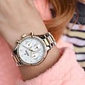Корпус из нержавеющей стали. Браслет из стали с частичным PVDPVDУльтратонкое покрытие наносится в технике вакуумного напыления, сочетает в себе нитрид титана особой прочности со слоем золота или оксида хрома. Несёт в себе декоративную или защитную функцию. покрытием. Браслет на раскладной застёжкеРаскладная застёжкаТакой тип застёжки используется только на браслетах из металла. Она никогда не раскрывается полностью, происходит разделение на 2 и более частей. Раскладывающая застёжка снизит вероятность потери часов к минимуму.. БезельБезельВнешний ободок, закрепляющий стекло. В спортивных часах так называется поворотное кольцо с делениями на циферблате, выполняет роль таймера – замеряет отрезки времени на шкале. Неподвижный безель – элемент декора. Однонаправленно вращающийся безель на дайверских часах позволяет фиксировать моменты погружения и выныривания на поверхность. и циферблат инкрустированы кристаллами. Рифленая заводная головка.