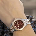 Яркий стиль и функциональность этих часов придутся по душе активной девушке. Кварцевый механизм с высокой точностью. Минеральное стеклоМинеральное стеклоМинеральное стекло представляет собой искусственно выращенный минерал кварца. Такое стекло отличается особой устойчивостью к повреждениям и царапинам. Уступает по некоторым качествам сапфировому стеклу. устойчивое к появлению царапин, обладающее высокой прозрачностью. Циферблат выполнен по технологии Sunray (солнечные лучи). Класс водозащиты: 100 метров, позволит плавать, нырять и заниматься другими водными видами спорта. Стрелки с люминесцентным покрытиемЛюминесцентное покрытиеПозволяет считывать показания времени в темноте. Производители наносят на стрелки, часовые индексы, безель или поверхность циферблата светонакопительный состав, дающий холодное свечение.. Корпус часов изготовлен из нержавеющей стали. БезельБезельВнешний ободок, закрепляющий стекло. В спортивных часах так называется поворотное кольцо с делениями на циферблате, выполняет роль таймера – замеряет отрезки времени на шкале. Неподвижный безель – элемент декора. Однонаправленно вращающийся безель на дайверских часах позволяет фиксировать моменты погружения и выныривания на поверхность. c PVD-покрытиемPVDУльтратонкое покрытие наносится в технике вакуумного напыления, сочетает в себе нитрид титана особой прочности со слоем золота или оксида хрома. Несёт в себе декоративную или защитную функцию.. Браслет с частичным PVD-покрытиемPVDУльтратонкое покрытие наносится в технике вакуумного напыления, сочетает в себе нитрид титана особой прочности со слоем золота или оксида хрома. Несёт в себе декоративную или защитную функцию. и с раскладной застёжкойРаскладная застёжкаТакой тип застёжки используется только на браслетах из металла. Она никогда не раскрывается полностью, происходит разделение на 2 и более частей. Раскладывающая застёжка снизит вероятность потери часов к минимуму..