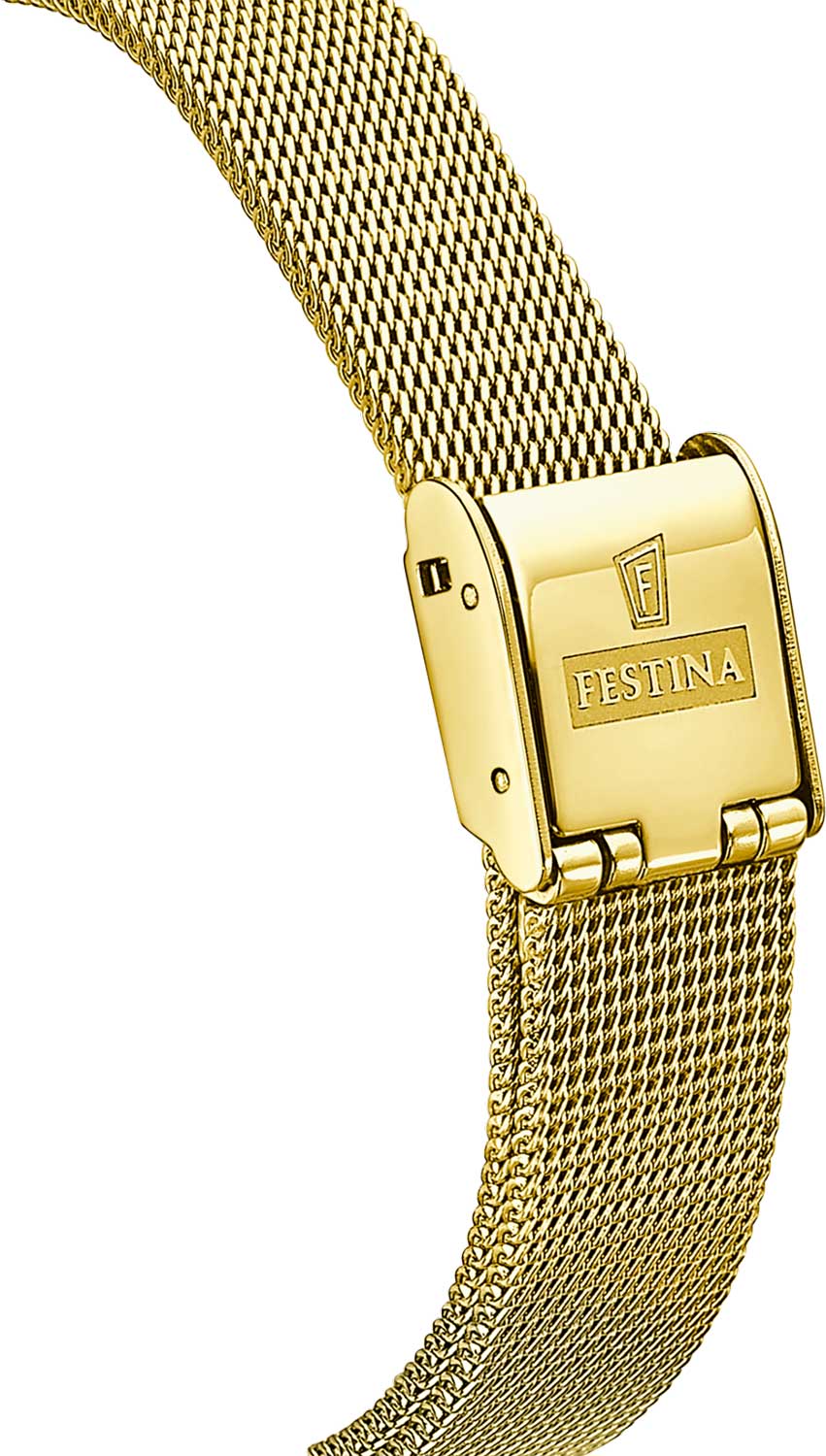 Женские механические часы-скелетоны Festina Automatic F20580/1, механический механизм (автоматический калибр) с высокой точностью. Сапфировое стеклоСапфировое стеклоПрочный и надёжный материал из кристалла сапфира синтетического происхождения, характеризующийся особой твёрдостью и устойчивостью к царапинам и повреждениям. устойчивое к появлению царапин, обладающее высокой прозрачностью. Класс водозащиты: 50 метров, позволит защитить корпус от случайных брызг или капель дождя. Корпус часов изготовлен из стали с PVD-покрытиемPVDУльтратонкое покрытие наносится в технике вакуумного напыления, сочетает в себе нитрид титана особой прочности со слоем золота или оксида хрома. Несёт в себе декоративную или защитную функцию.. Стальной миланского плетения браслет на раскладной застёжкеРаскладная застёжкаТакой тип застёжки используется только на браслетах из металла. Она никогда не раскрывается полностью, происходит разделение на 2 и более частей. Раскладывающая застёжка снизит вероятность потери часов к минимуму. с PVD-покрытиемPVDУльтратонкое покрытие наносится в технике вакуумного напыления, сочетает в себе нитрид титана особой прочности со слоем золота или оксида хрома. Несёт в себе декоративную или защитную функцию.. БезельБезельВнешний ободок, закрепляющий стекло. В спортивных часах так называется поворотное кольцо с делениями на циферблате, выполняет роль таймера – замеряет отрезки времени на шкале. Неподвижный безель – элемент декора. Однонаправленно вращающийся безель на дайверских часах позволяет фиксировать моменты погружения и выныривания на поверхность. с PVD-покрытиемPVDУльтратонкое покрытие наносится в технике вакуумного напыления, сочетает в себе нитрид титана особой прочности со слоем золота или оксида хрома. Несёт в себе декоративную или защитную функцию.. Циферблат с метками в виде штрихов и арабских цифр. Рифленая заводная головка.