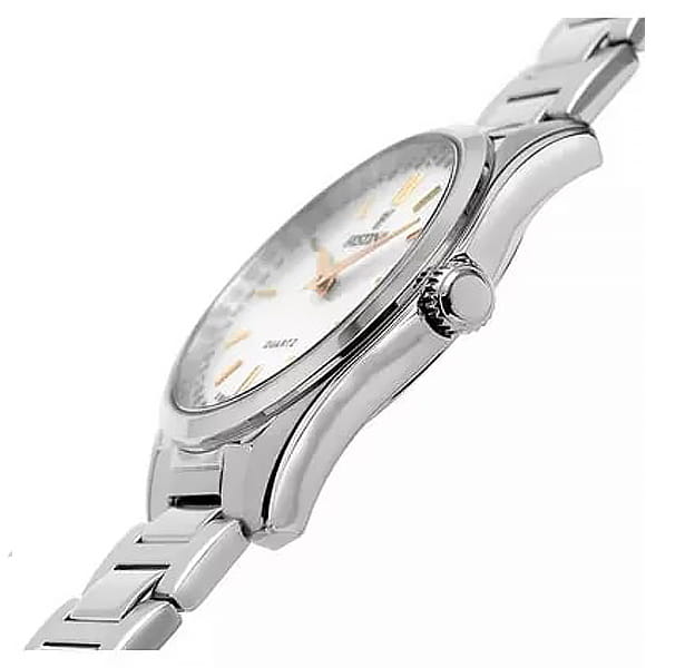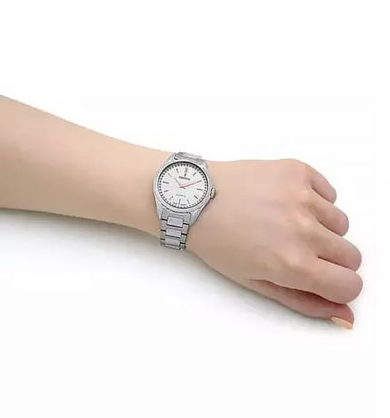 Яркий стиль и функциональность этих часов придутся по душе активной девушке. Кварцевый механизм с высокой точностью. Минеральное стеклоМинеральное стеклоМинеральное стекло представляет собой искусственно выращенный минерал кварца. Такое стекло отличается особой устойчивостью к повреждениям и царапинам. Уступает по некоторым качествам сапфировому стеклу. устойчивое к появлению царапин, обладающее высокой прозрачностью. Циферблат украшен цирконами. Класс водозащиты: 50 метров, позволит защитить часы от капель дождя. Корпус часов изготовлен из нержавеющей стали 316L. Браслет с раскладной застёжкойРаскладная застёжкаТакой тип застёжки используется только на браслетах из металла. Она никогда не раскрывается полностью, происходит разделение на 2 и более частей. Раскладывающая застёжка снизит вероятность потери часов к минимуму..